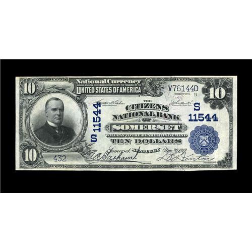 <B>Somerset, KY</B></I> - $10 1902 Plain Back Fr. 632 <B>The Citizens NB</B></I> Ch. # (S)11544<BR>A very attractive note which is by far the nicest of the eight large examples listed in the census from here, all of which, save for this piece, grade Fine or worse. This specimen came to Bill from the Martin collection. <B>Extremely Fine-About Uncirculated.</B></I>