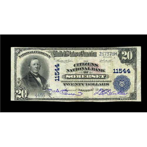 <B>Somerset, KY</B></I> - $20 1902 Plain Back Fr. 658 <B>The Citizens NB</B></I> Ch. # 11544<BR>This note is the nicest of the three $20 Plain Backs documented in the census from here. This bank was chartered late enough that its large issue extended only to $10 and $20 Plain Backs, including this solid <B>Fine-Very Fine.</B></I>
