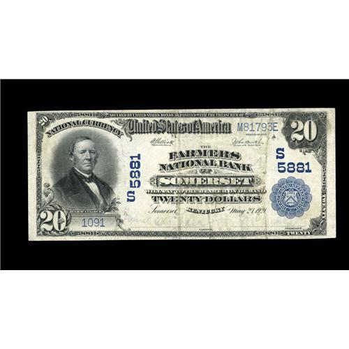 <B>Somerset, KY</B></I> - $20 1902 Plain Back Fr. 659 <B>The Farmers NB</B></I> Ch. # (S)5881<BR>This <B>Fine</B></I> note is one of only three $20 Plain Backs documented from here. It enjoys fully wide margins and is pleasantly bright for the grade.