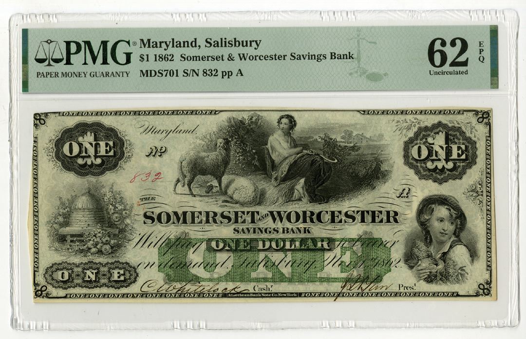 Salisbury, Maryland, 1862. $1, MDS701, Issued Obsolete Banknote, Black on green underprint, Allegorical woman with sheep at top, Bee hive at lower left, and young girl at lower right, S/N 832 pp A, PMG graded Uncirculated 62 EPQ. ABNC.