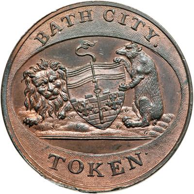 Somersetshire. Bath. Halfpenny, ND. D&H-77. Edge: Plain. St. Mary's Chapel. Reverse: Arms and supporters of Bath. Die break on left side. Scarce. NGC graded MS-63 Brown.
