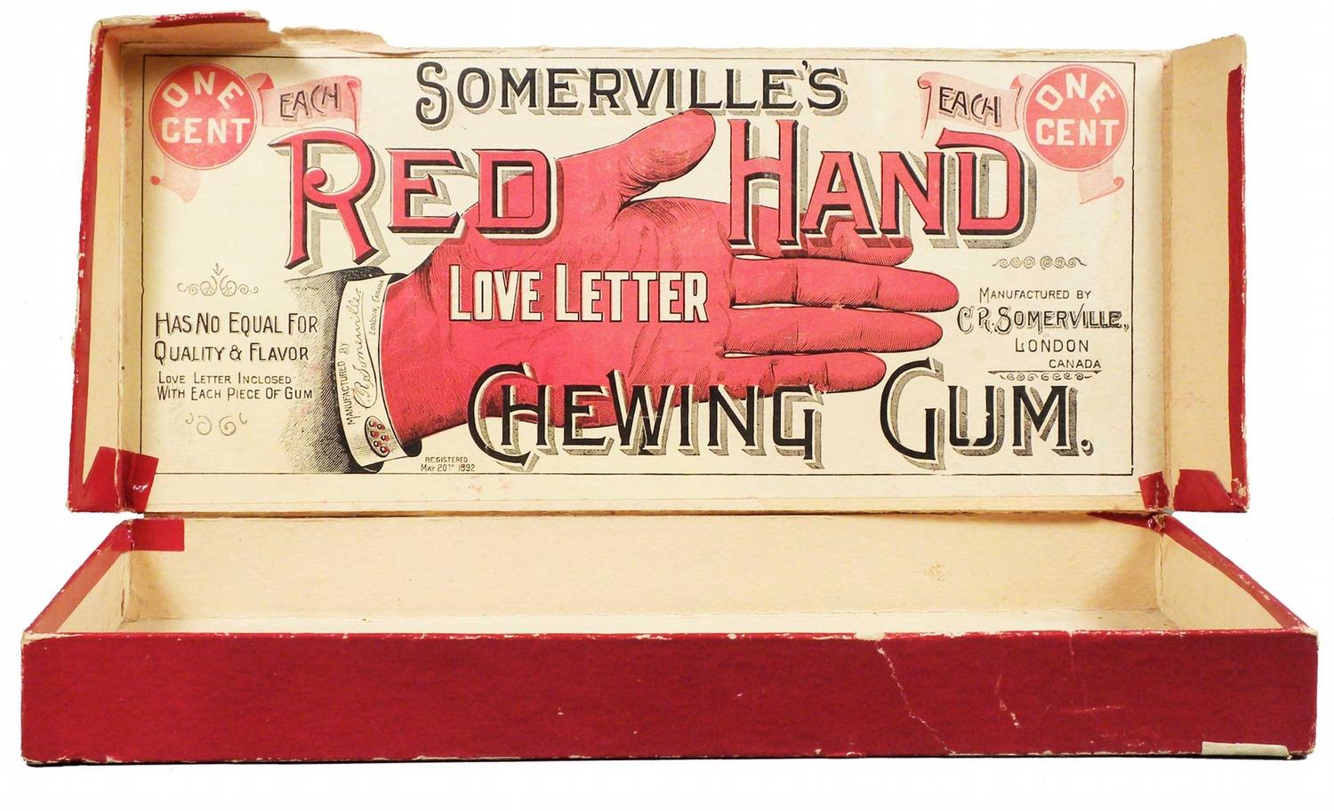 Rare Somerville's Red Hand Love Letter Chewing Gum Hardboard Box. Love Letter enclosed with each piece of gum. Mfg. by C.R. Somerville, London, Canada. Front edge of lid is missing otherwise good condition. 12 3/4 X 1 1/2 X 5 3/4 inches.