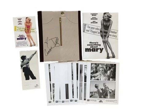 Something About Mary (1998) Cameron Diaz Signed Press Kit - includes photocards, postcards, script summary, authenticity. This is an amazing collector's item! A high quality press kit for fans of the smash hit! The elaborate folder is covered with felt and designed to look like a pair of pants with a zipper (reminiscent of that hilarious scene). Inside is nine black and white publicity stills (8 1/2" x10), a full PR booklet and a five-postcard pack of directors the Farrelly Brothers in spoofs from other "Mary" films. The kit was personally signed by Cameron Diaz. Includes a certificate of authenticity from The Entertainment Industry Foundation in support of the Juvenile Diabetes Foundation International. The Entertainment Industry Foundation serves as a gateway to giving for the entertainment industry, creating and supporting groundbreaking programs and campaigns that raise awareness and funds for issues that affect millions of people around the world.