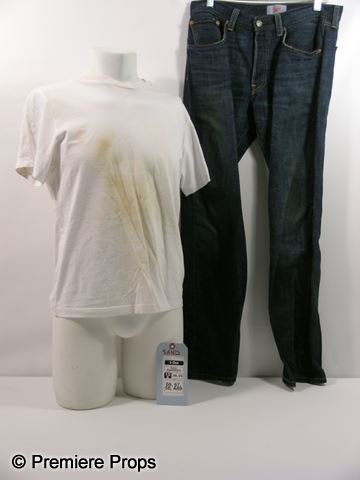 Dex (Colin Egglesfield) screen worn, sand on the front, white short sleeve crew neck 'J. Crew' t-shirt, (size S) and blue denim 'Levi 501' jeans. (no size) Includes wardrobe tag!