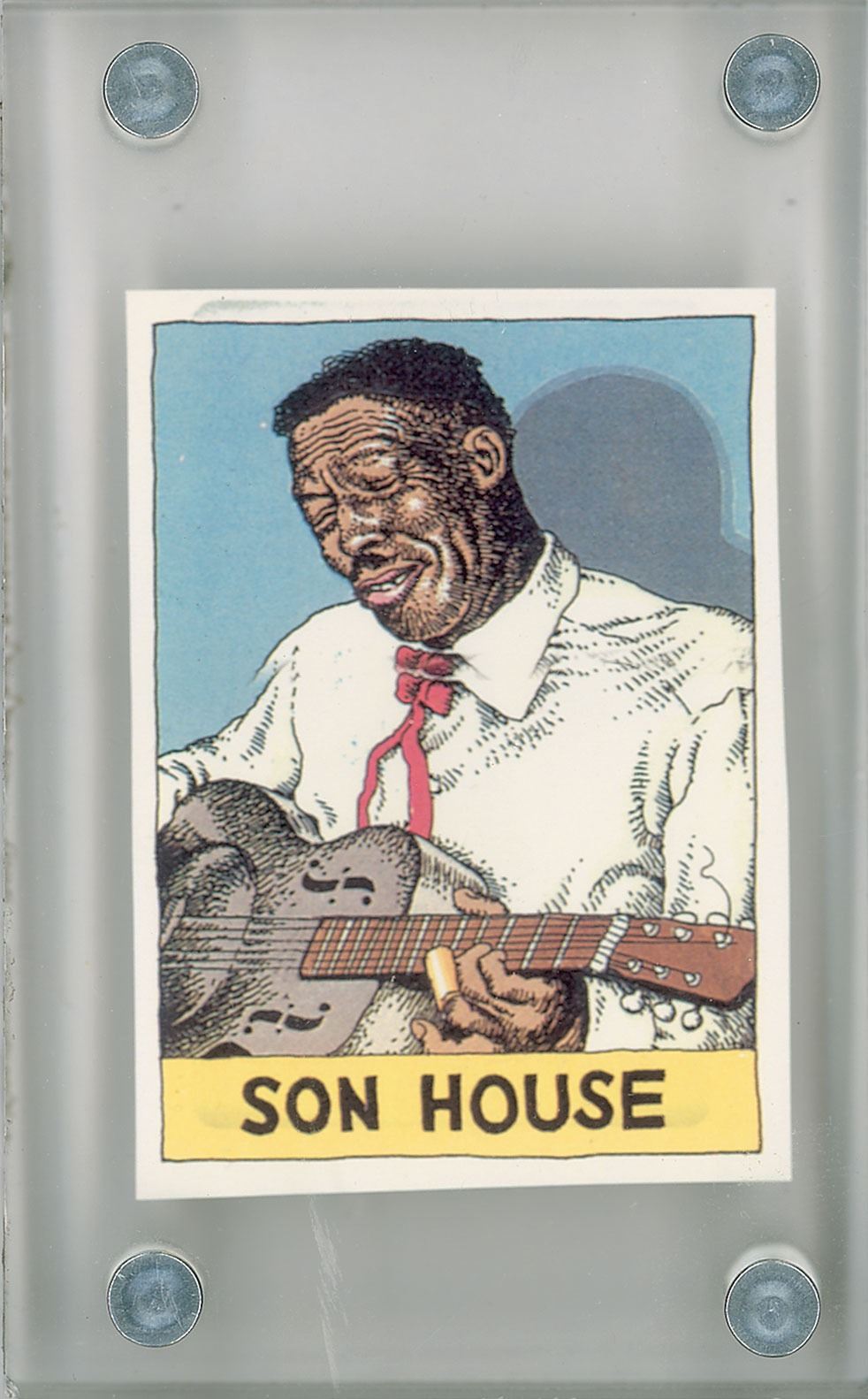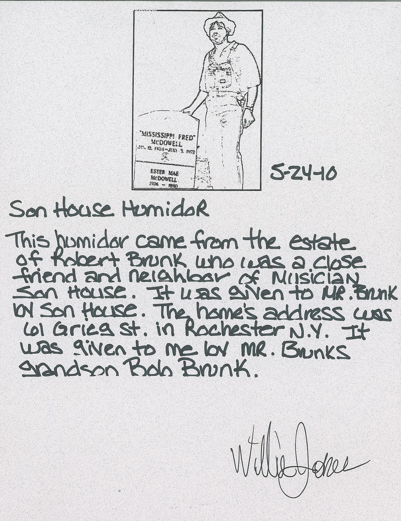 Glass jar–type cigar humidor with a metal lid owned by Delta blues singer and guitarist Son House and given to his neighbor in Rochester, New York, measuring 4? in diameter and 6? tall, marked on the bottom, "Dun-Rite Wood Products, New York." In fine condition. Accompanied by a letter of provenance, in full: "This humidor came from the estate of Robert Brunk who was a close friend and neighbor of musician Son House. It was given to Mr. Brunk by Son House. The home's address was 61 Grieg St. in Rochester, N.Y. It was given to me by Mr. Brunk's grandson Bob Brunk." Also includes a small color print of an artist's rendering of House. In 1943, House retired from music and moved from the Mississippi Delta to Rochester, New York, where he found work as a railroad porter and chef. He was 'rediscovered' in Rochester in 1964 during the folk blues revival, and resumed touring the United States and Europe.