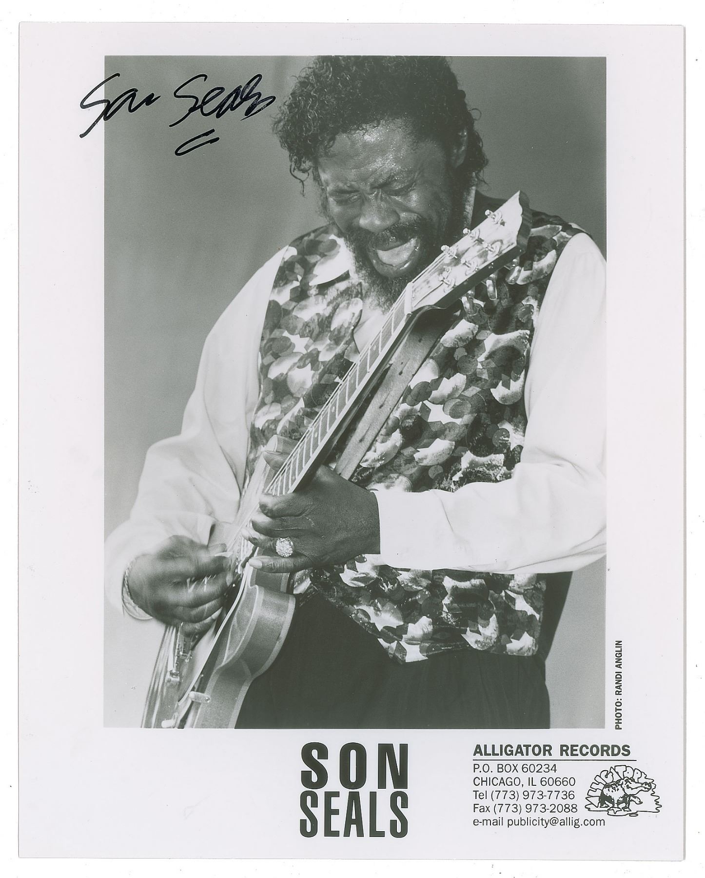Chicago-based electric blues guitarist and singer (1942–2004) who began performing professionally at the age of 13; known for his intense and innovative guitar playing and his grainy singing voice, Seals played alongside other prominent blues musicians like Albert King, Rufus Thomas, Bobby Bland, Junior Parker, and Rosco Gordon. Uncommon glossy 8 x 10 Alligator Records publicity photo of Son Seals passionately playing his guitar, signed in black felt tip. In fine condition, with a small crease in the top border.