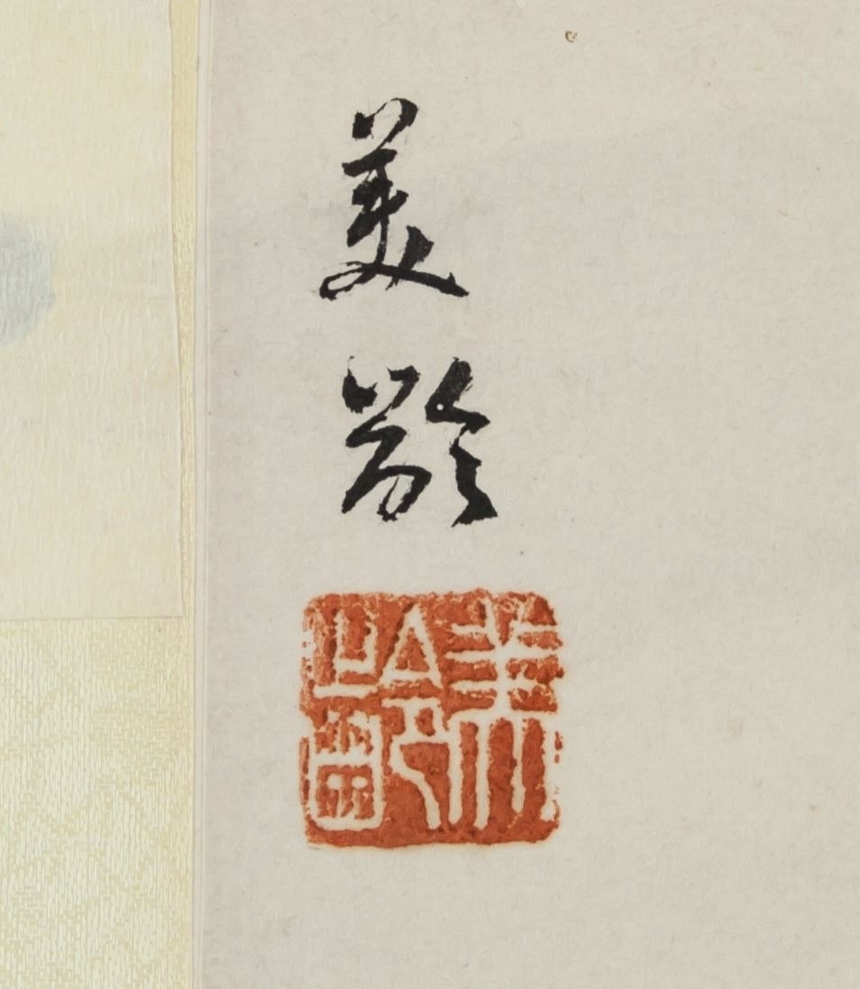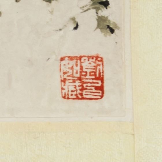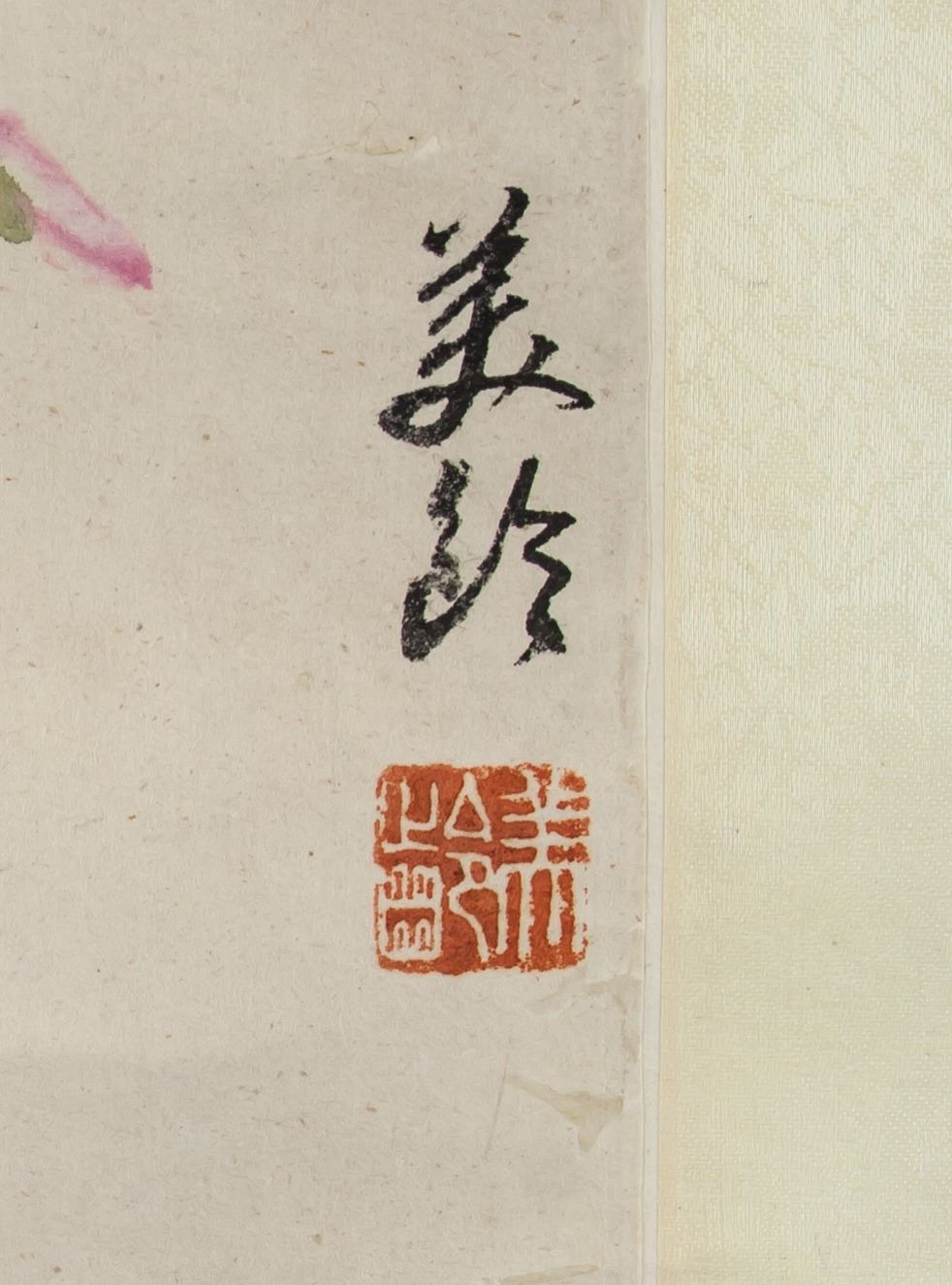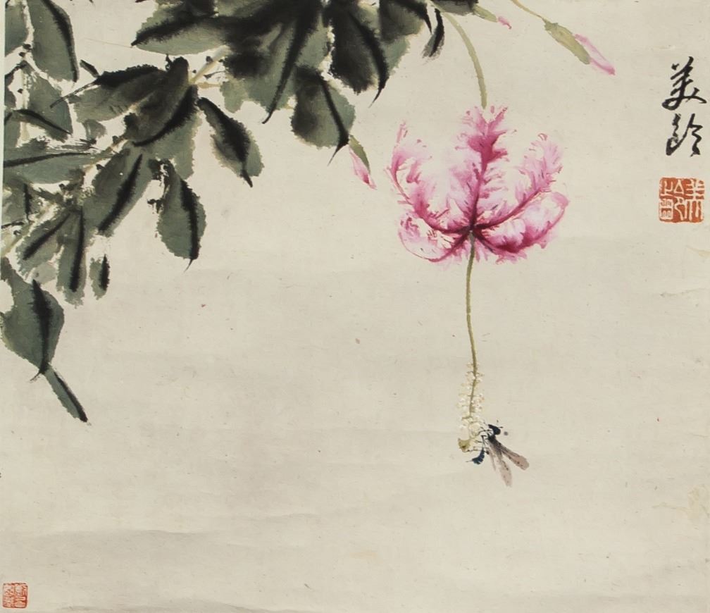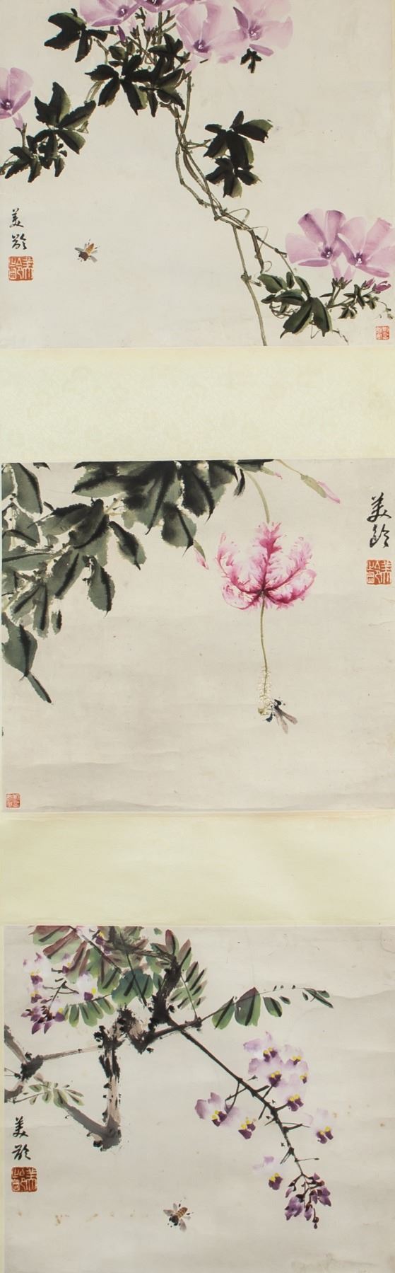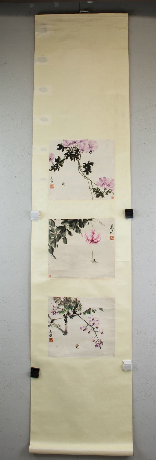 Ink and watercolor on three papers, mounted on one hanging scroll. Featuring painting of flowers and insects. Signed Song Meiling (1897-2003, Chinese), inscribed with 5 seals. 30 x 98 cm