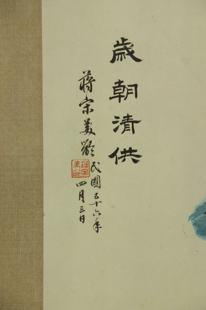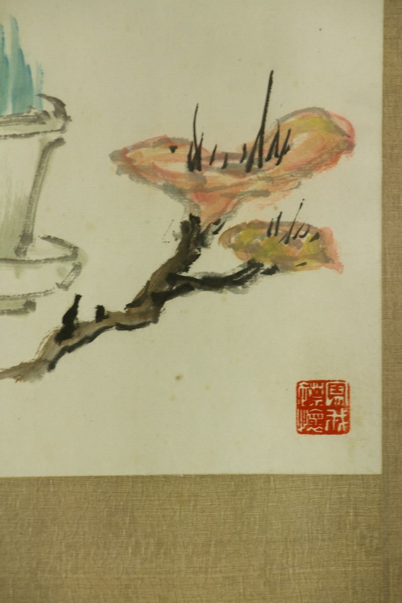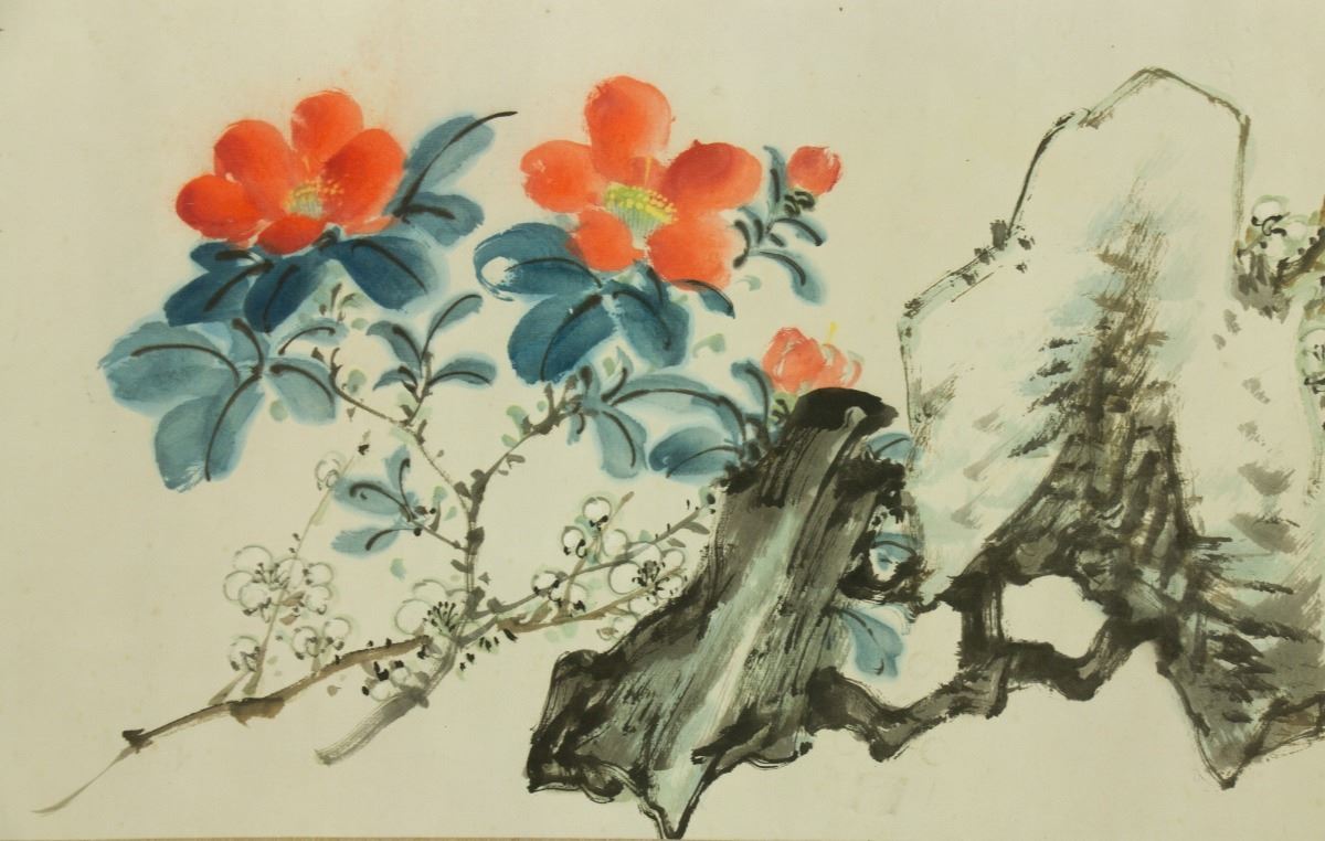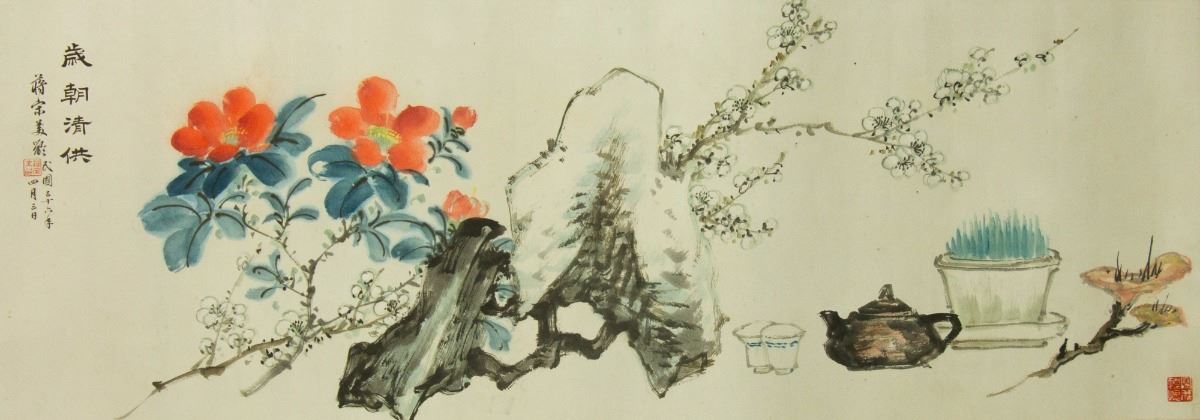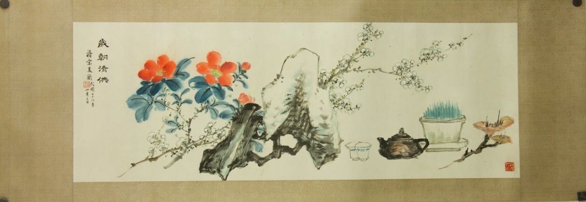 Plum blossom and peony with other still lifes;Chinese ink and watercolour on paper; signed Song Meiling (1898-2003) and inscribed with two artist seals; 33.5 cm × 95 cm