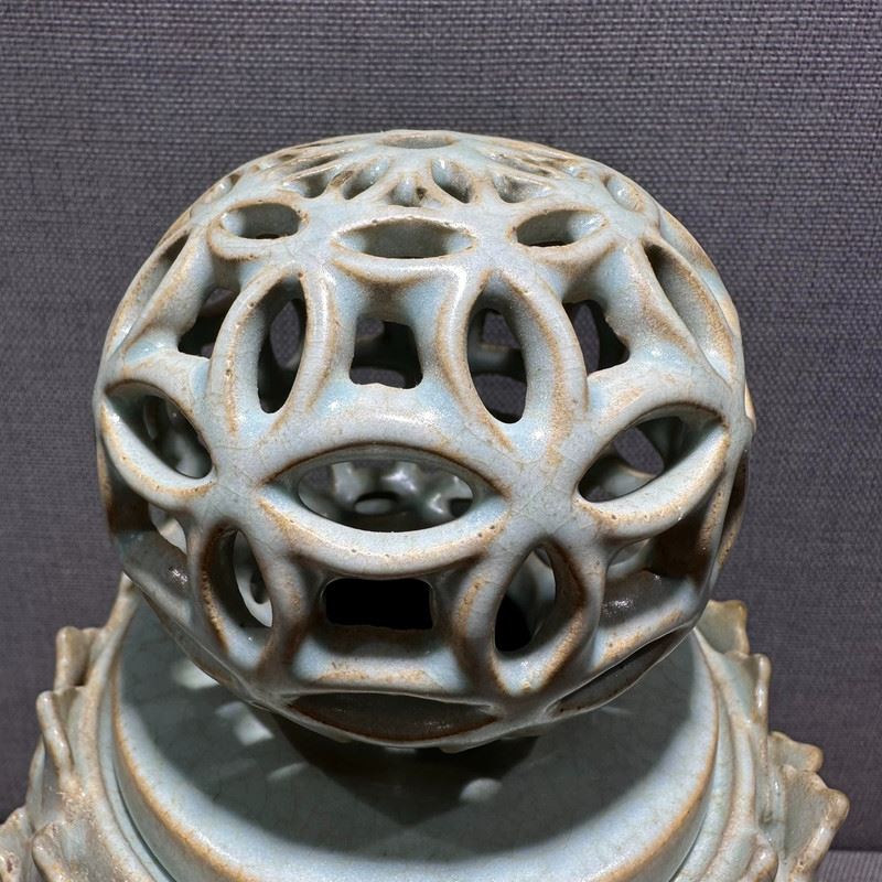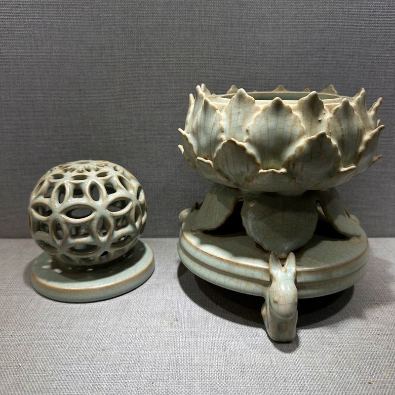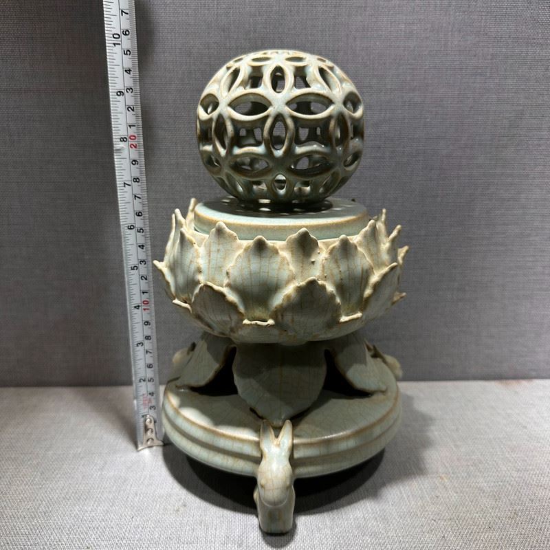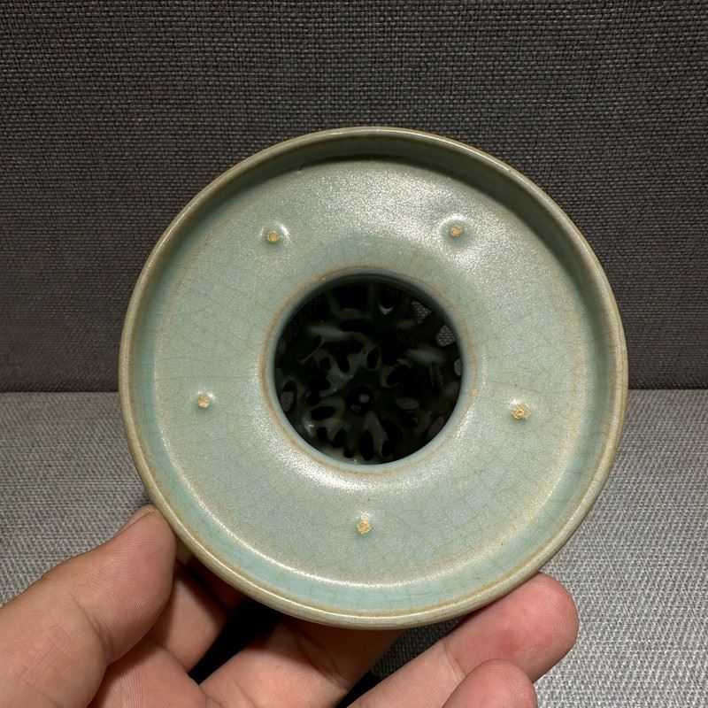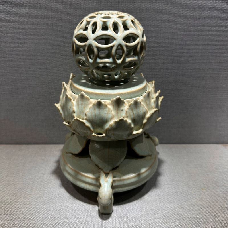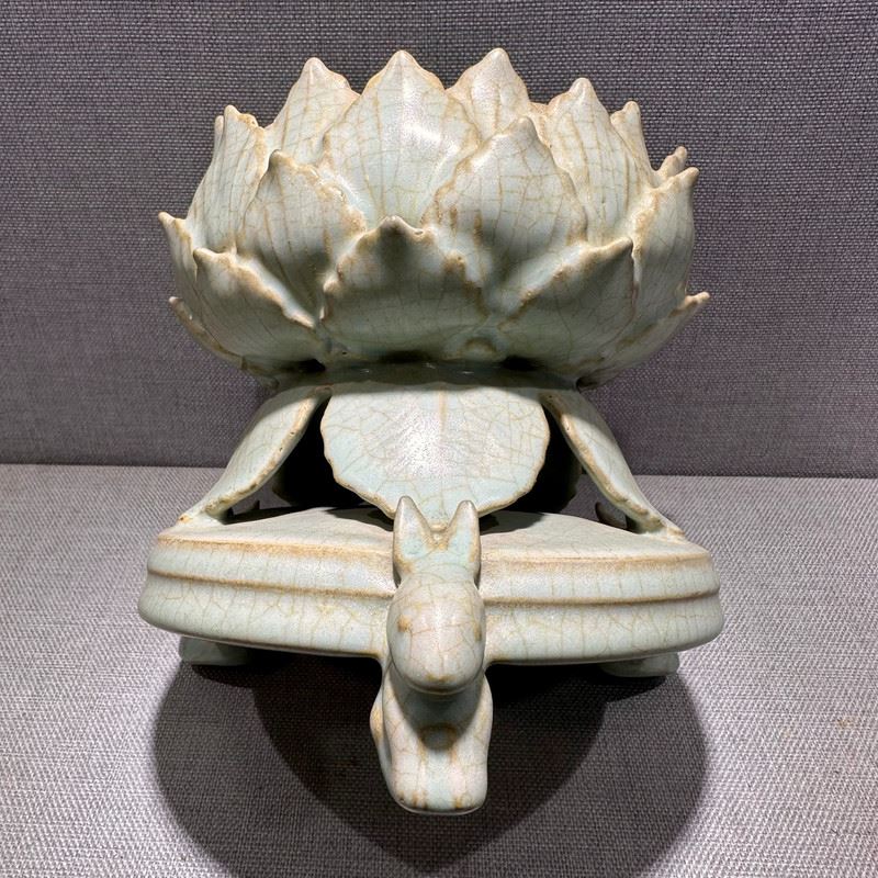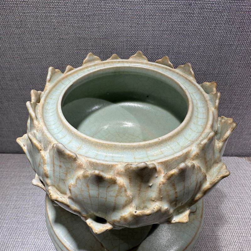 This Song Ru porcelain incense burner showcases the unique charm of Song Dynasty ceramics with its distinct Ru kiln glaze and exquisite design. The surface of the burner presents a smooth, lustrous, jade-like grey color, perfectly reflecting the classic aesthetics of Ru ware. The design of the body is simple yet elegant, combining both functionality and artistry, commonly used in Buddhist or scholarly incense rituals. This piece not only carries a rich historical and cultural atmosphere but is also a rare treasure among Song Dynasty Ru porcelain, holding significant artistic and collectible value.