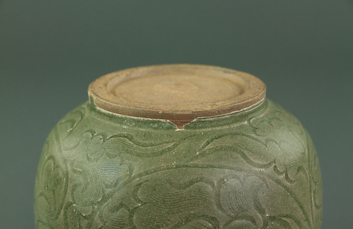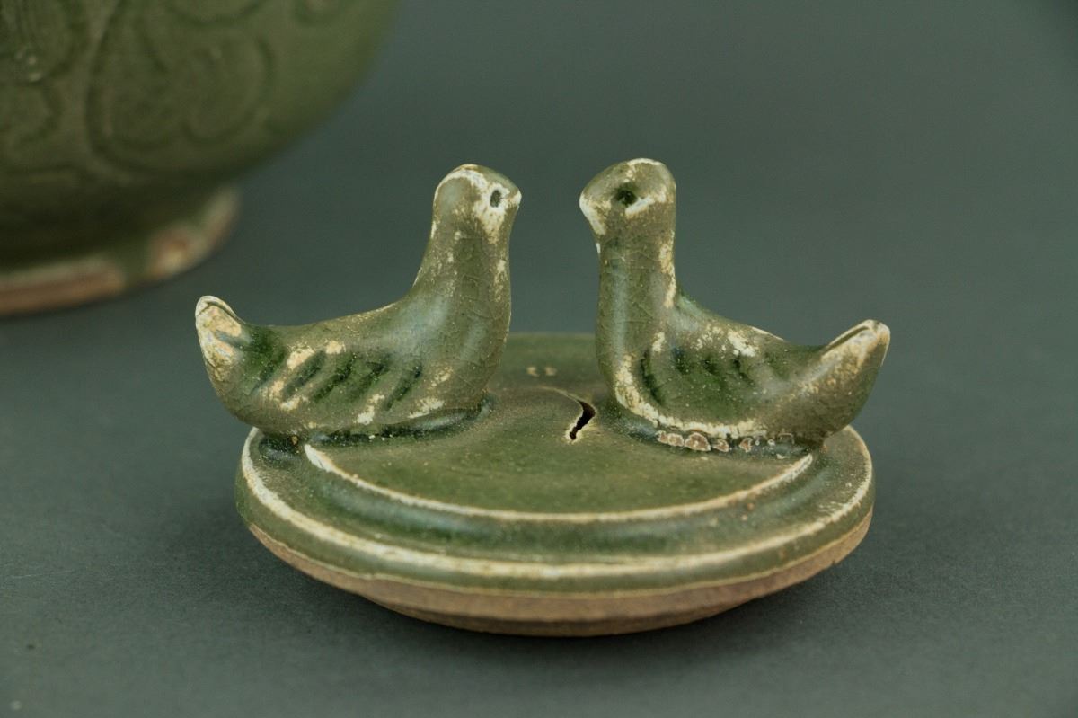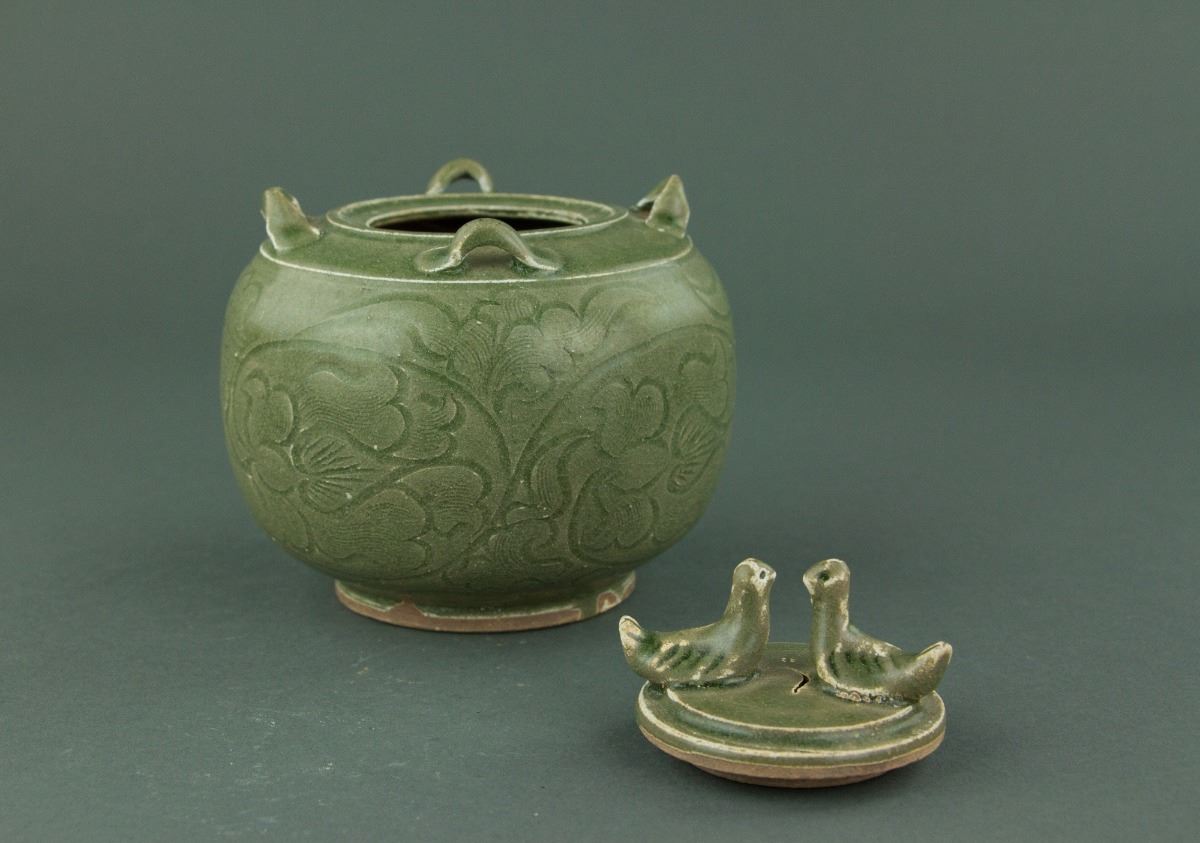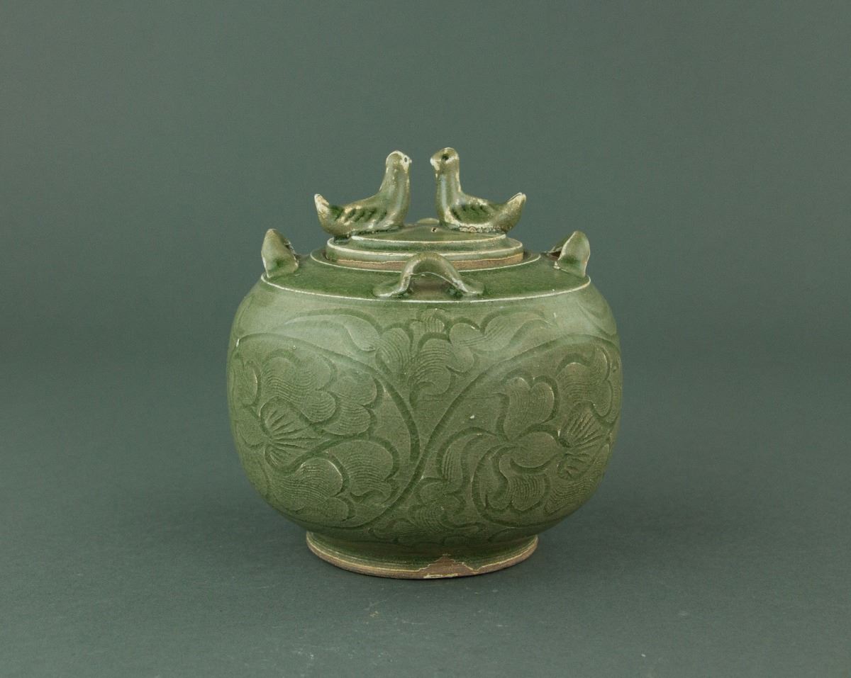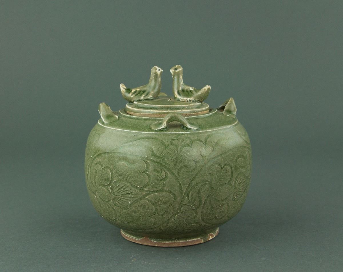 Chinese Song style porcelain jar and cover; of drum-shaped body rising from a circular foot rim; the shoulder set with four loop handles; the cover surmounted by double birds; incised with peony scrolls on celadon-glazed ground; unglazed base; H: 14 cm, D: 13 cm, 594 grams