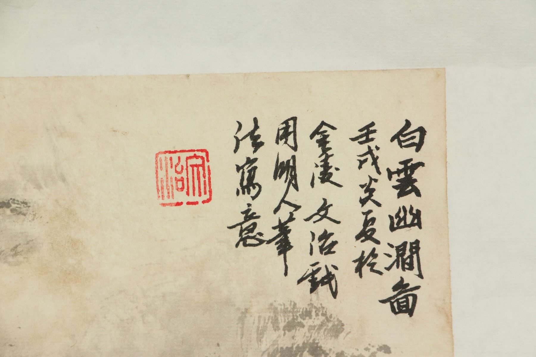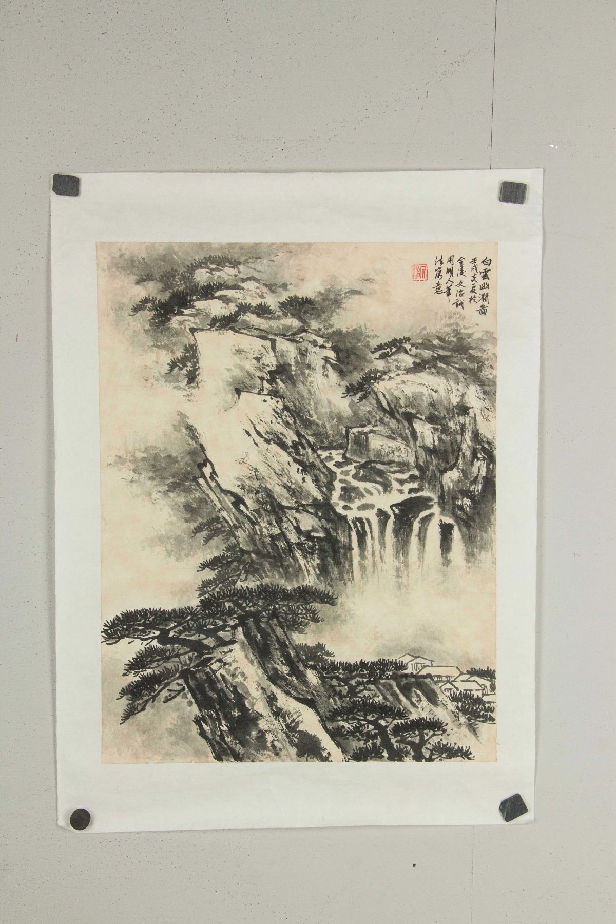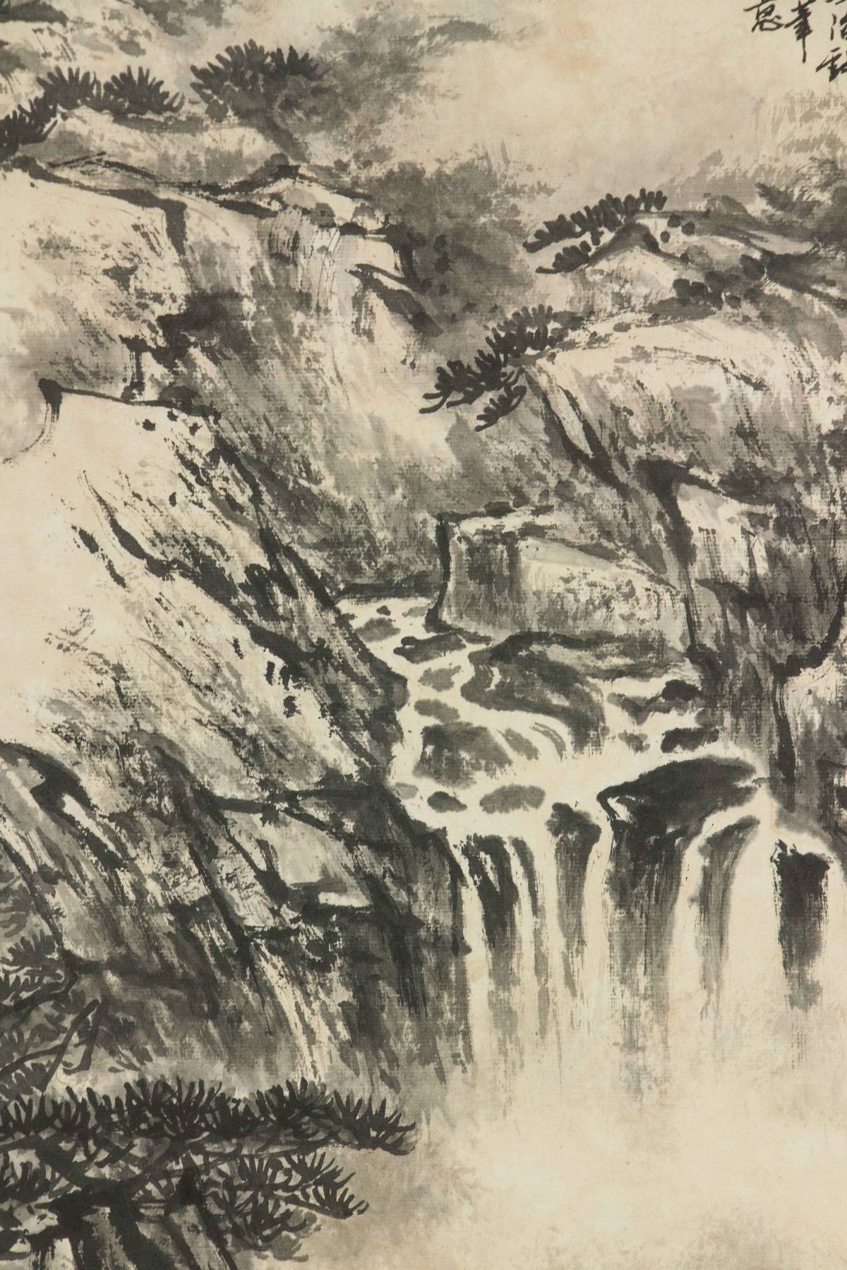 Mountainous landscape with waterfall; Chinese ink on paper roll; signed Song Wenzhi (1919-1999); inscribed with 1 artist seal; 51 cm x 39 cm