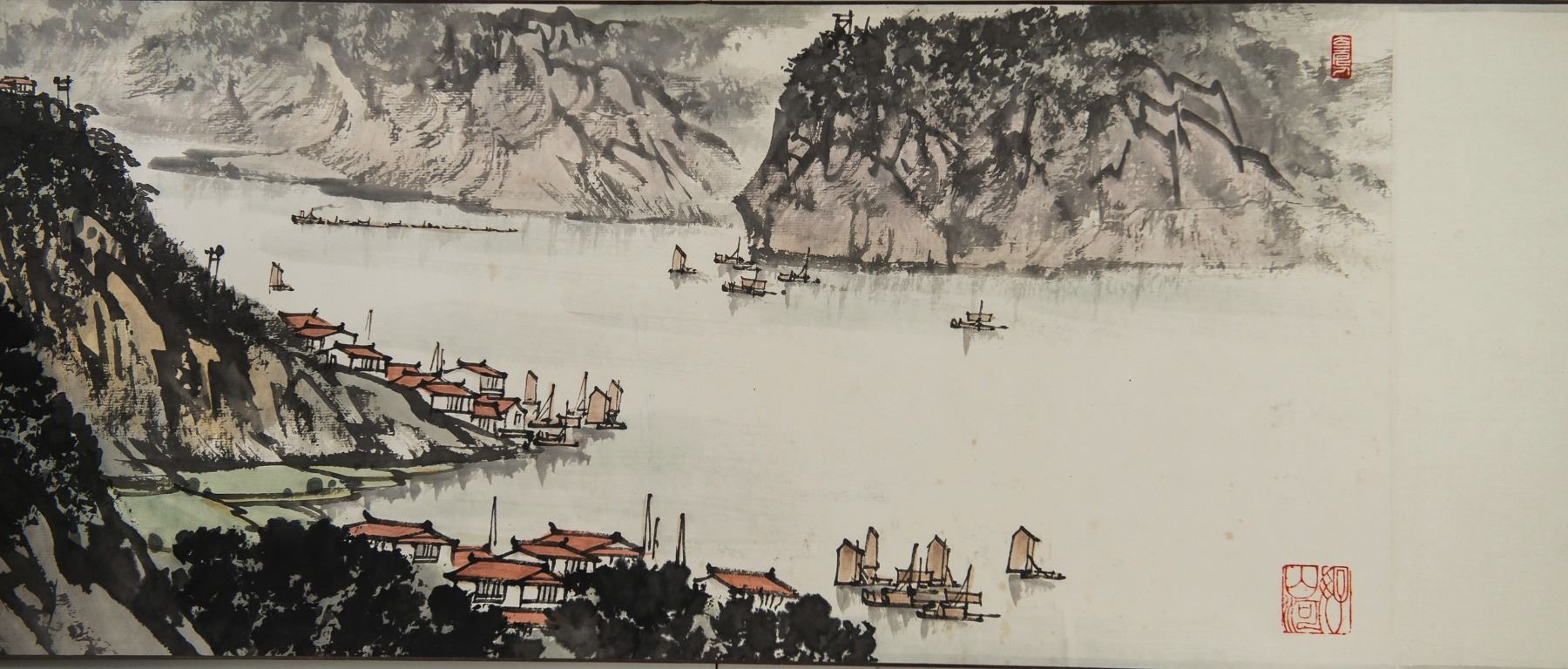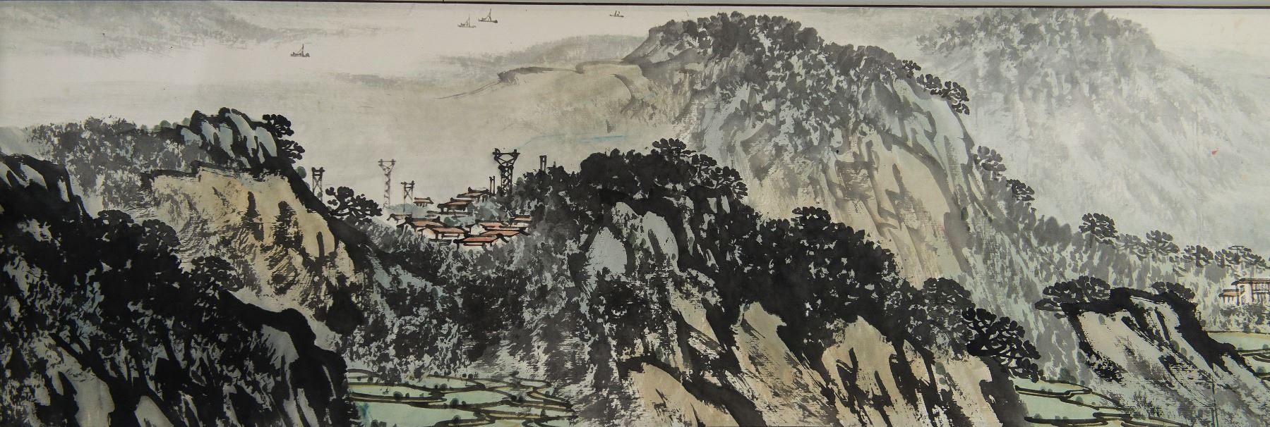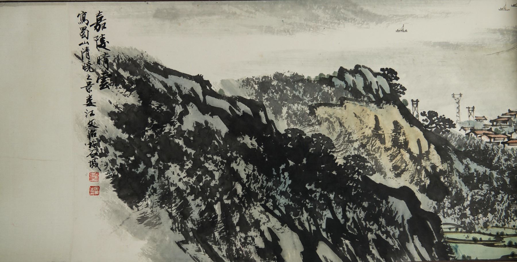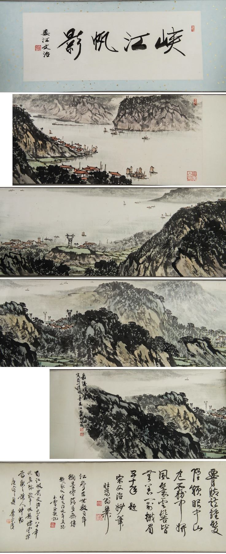 Ink and watercolor on paper, long horizontal hanging scroll. Featuring a Chinese landscape scene. Signed Song Wen Zhi 1919-1999 Chinese, inscribed with seals; 22 cm x 58 cm (first panel), 30 x 247 cm (second panel)