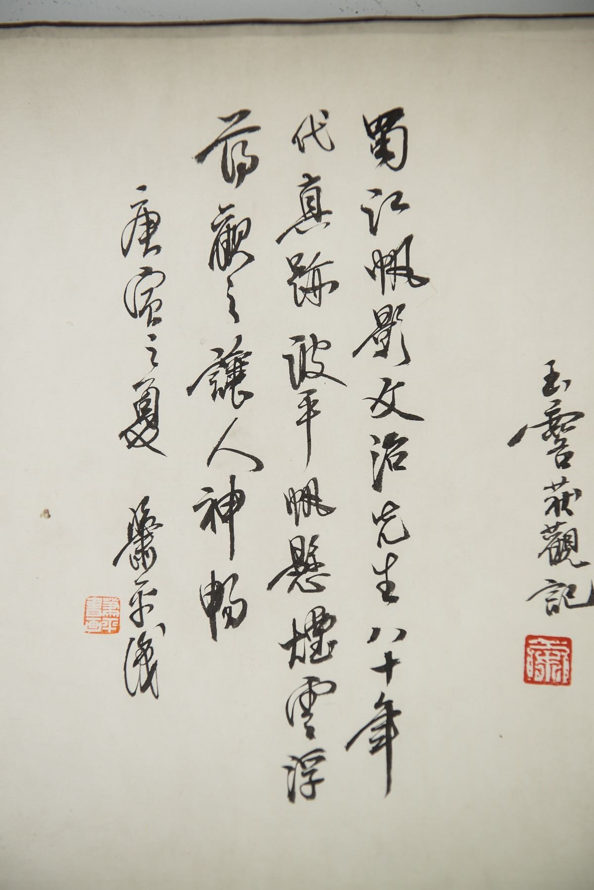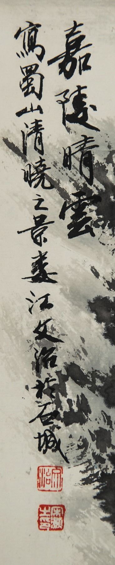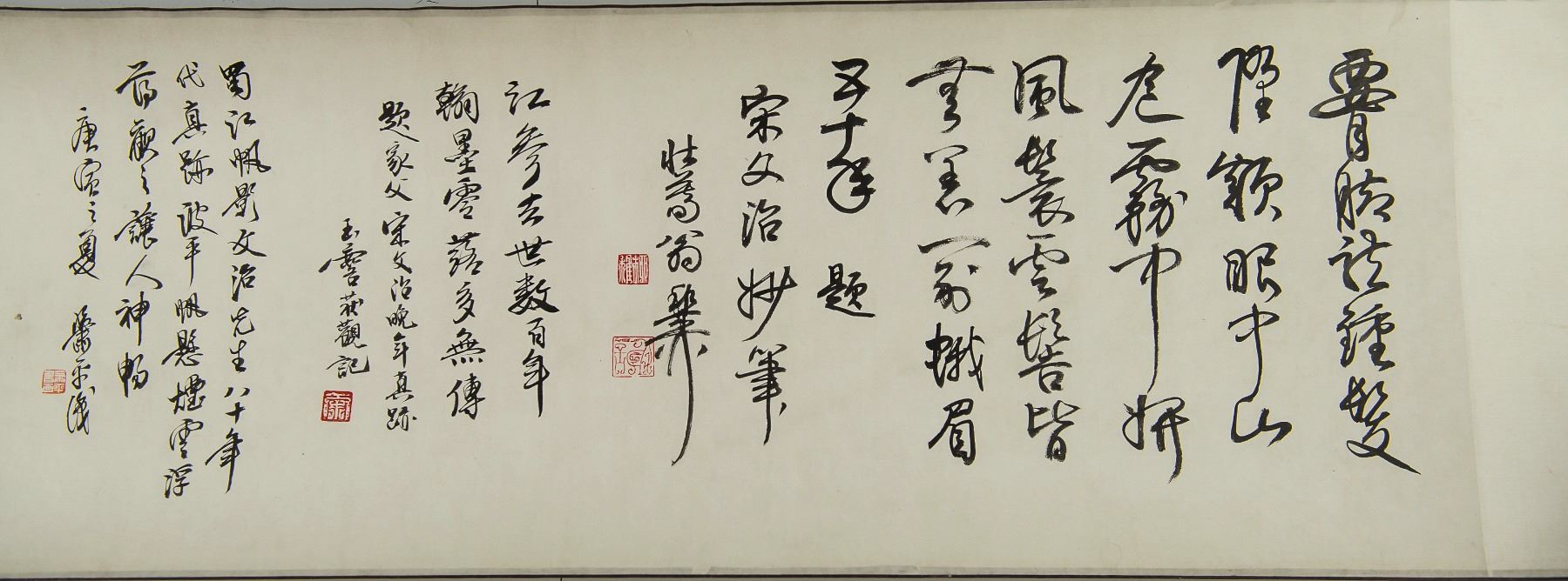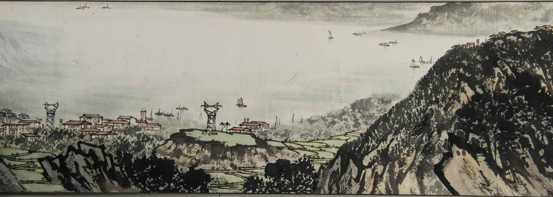 Ink and watercolor on paper, long horizontal hanging scroll. Featuring a Chinese landscape scene. Signed Song Wen Zhi 1919-1999 Chinese, inscribed with seals; 22 cm x 58 cm (first panel), 30 x 247 cm (second panel)