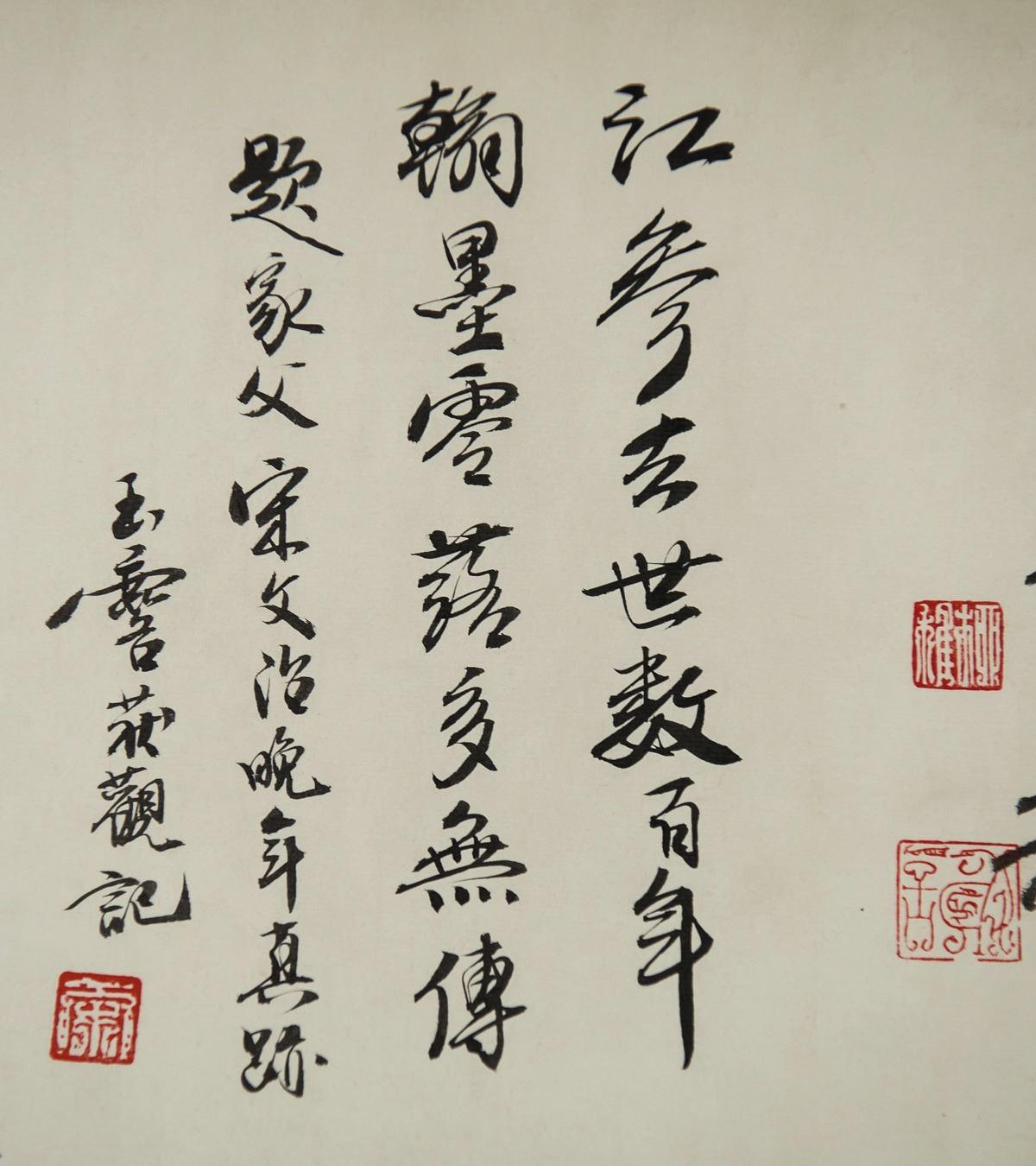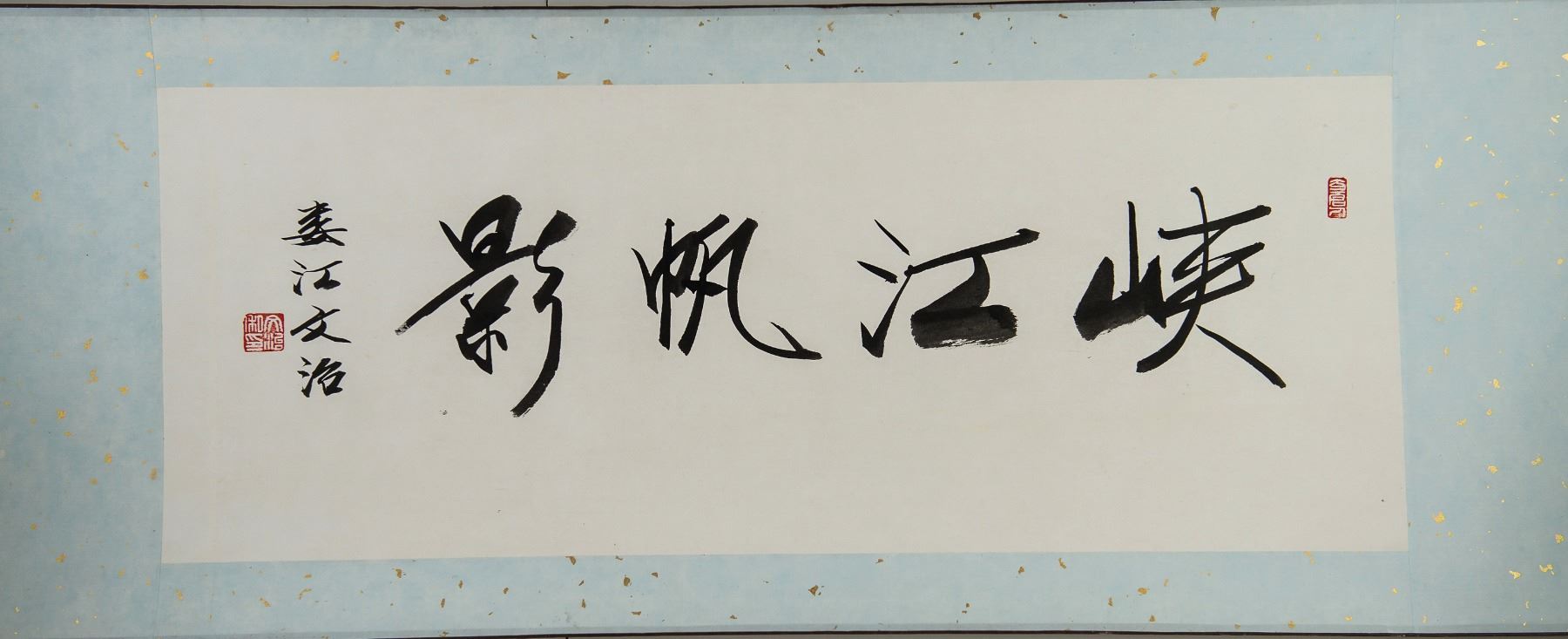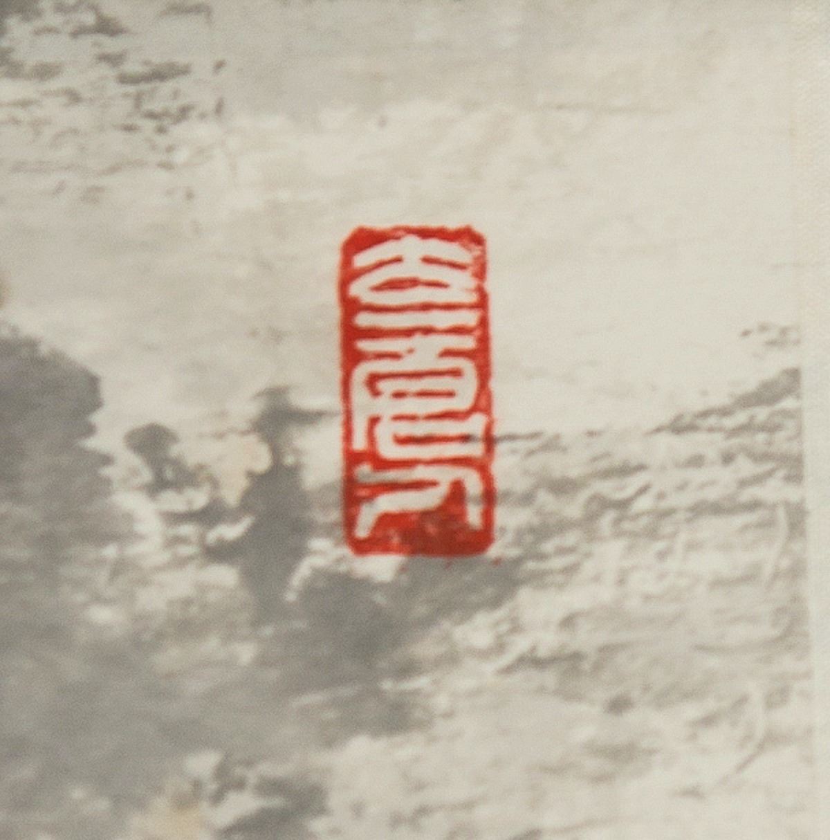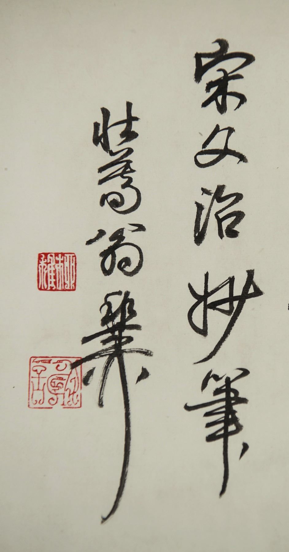 Ink and watercolor on paper, long horizontal hanging scroll. Featuring a Chinese landscape scene. Signed Song Wen Zhi 1919-1999 Chinese, inscribed with seals; 22 cm x 58 cm (first panel), 30 x 247 cm (second panel)