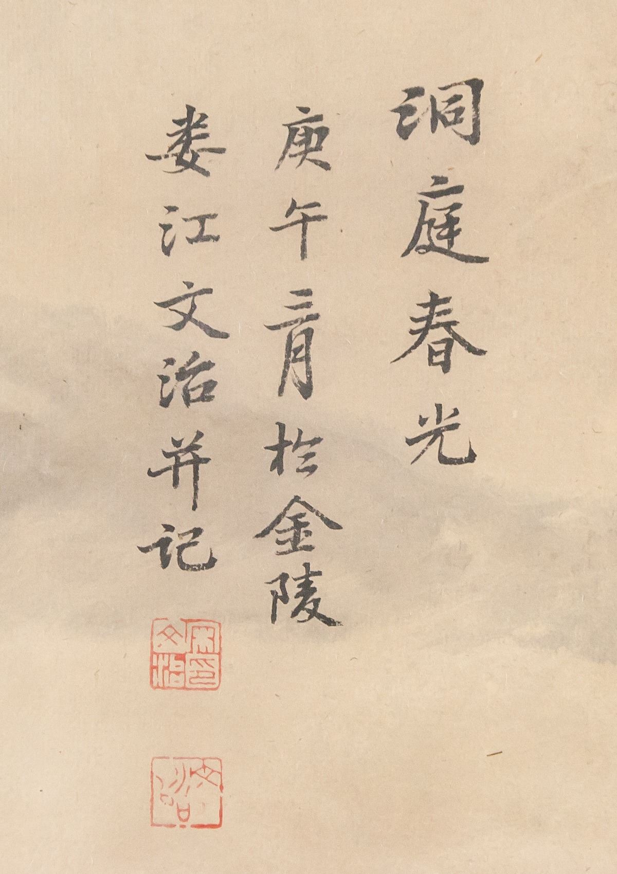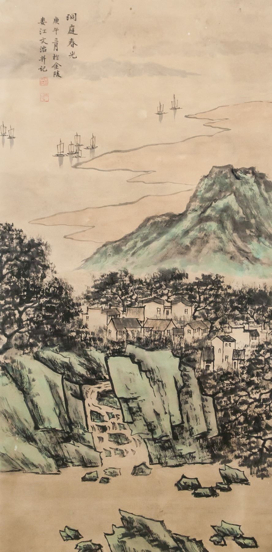 Chinese ink and watercolor on hanging scroll. Featuring landscape scene with homes nestled at the foot of a tall mountain. Signed "Wenzhi" in Chinese characters. Inscribed with two artist seals. Attributed to Song Wenzhi (1919-1999, Chinese). 98 x 49 cm