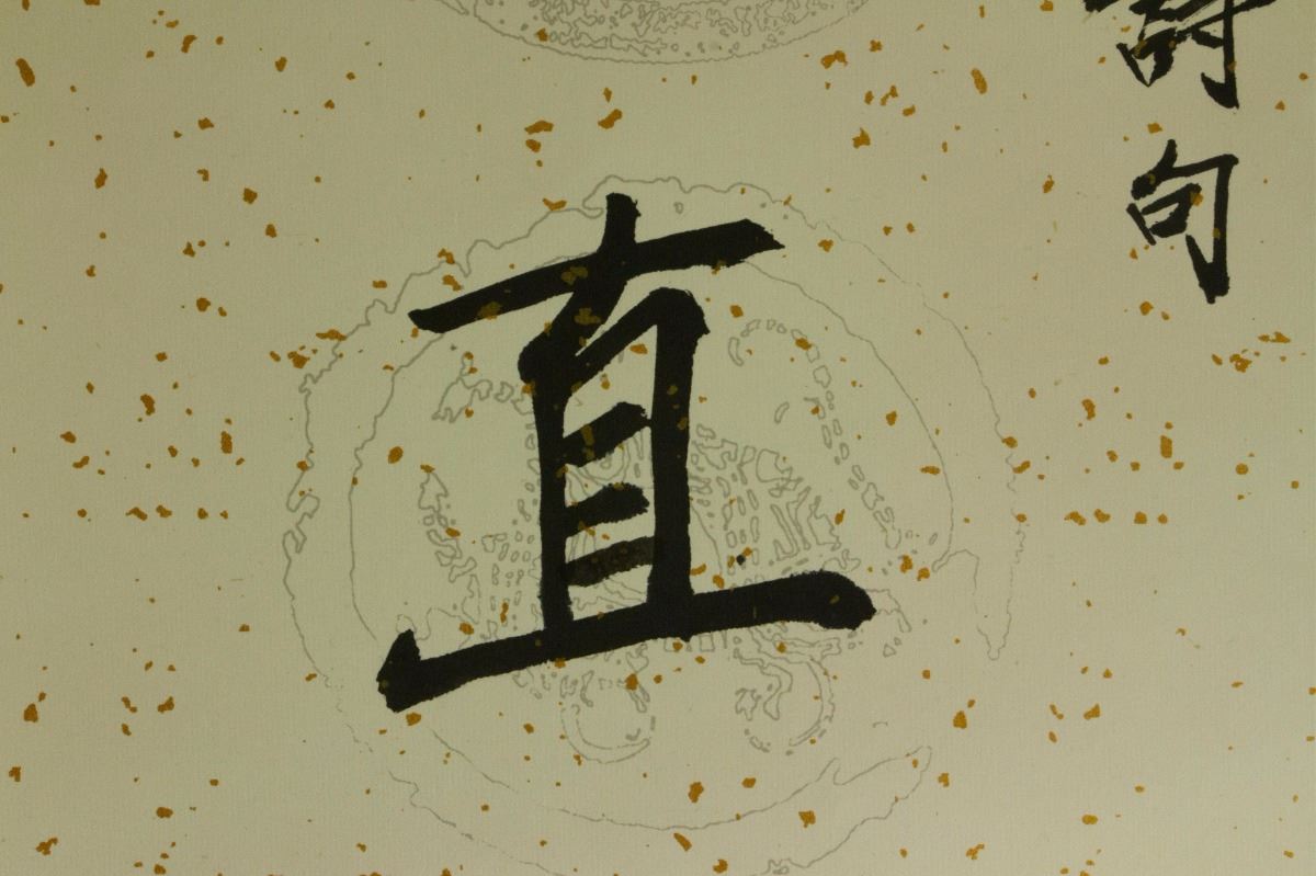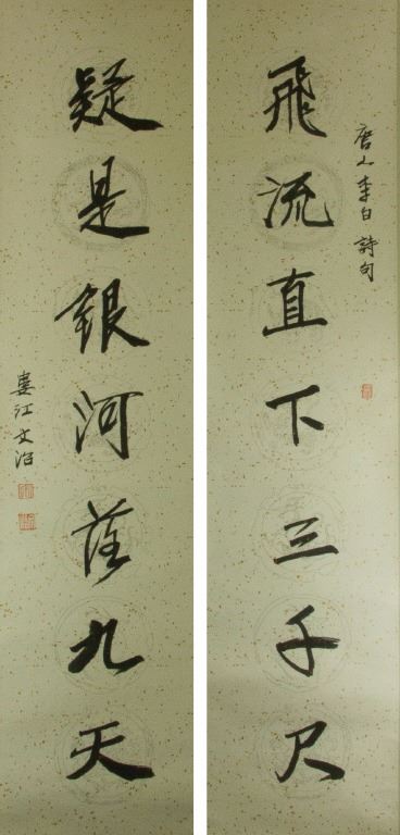 Calligraphy couplet; Chinese ink on paper; signed Song Wenzhi and inscribed with three artist seals; 136 cm x 33 cm each