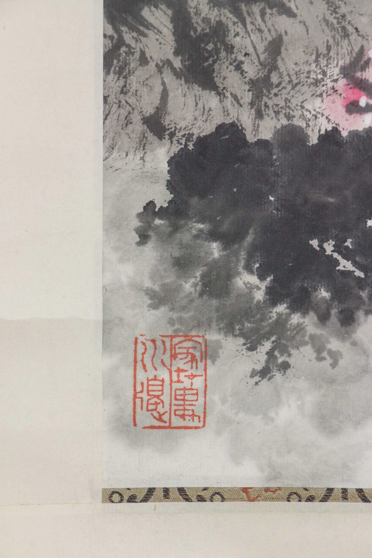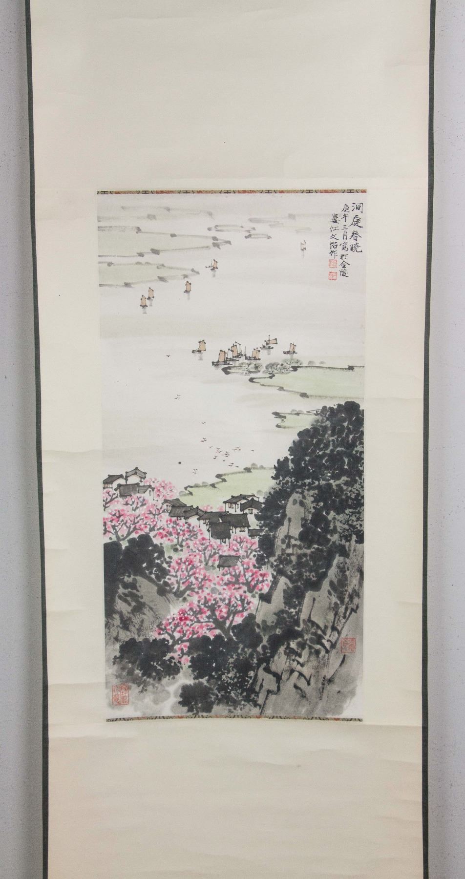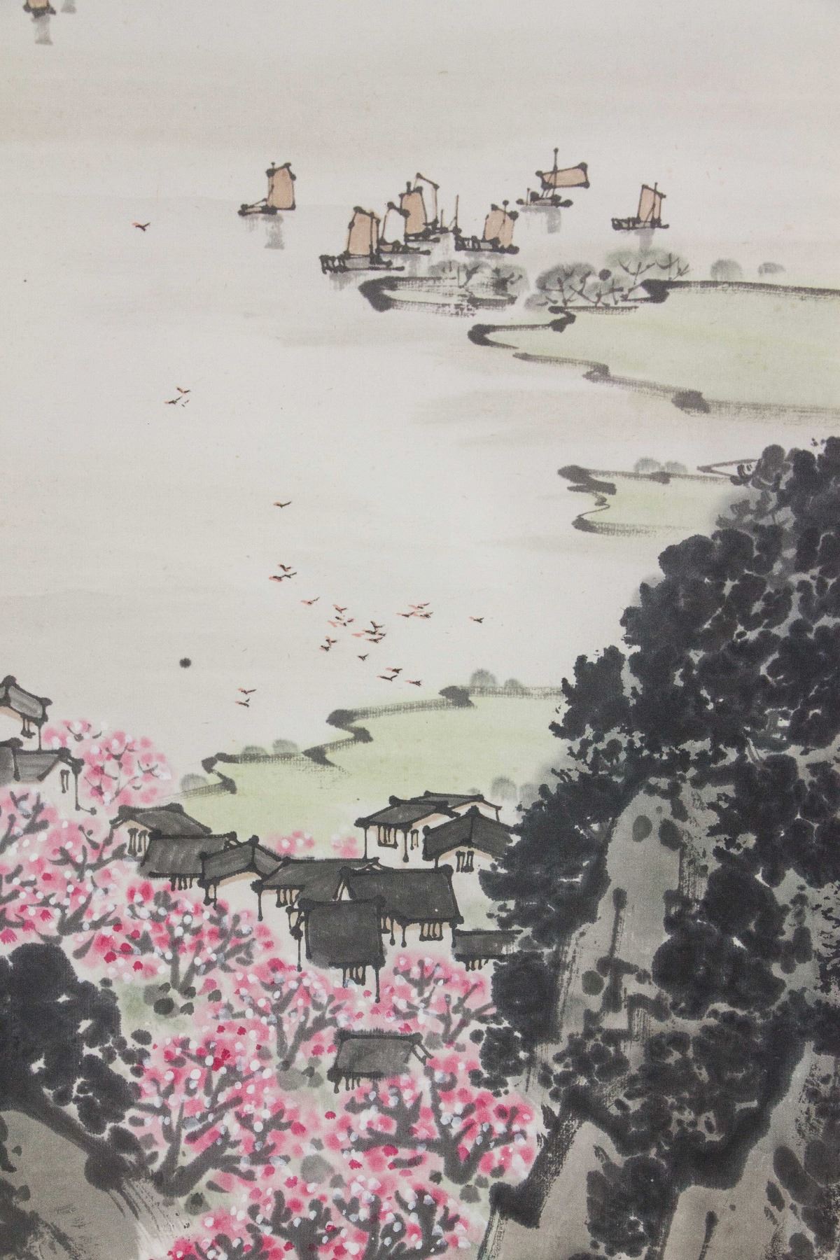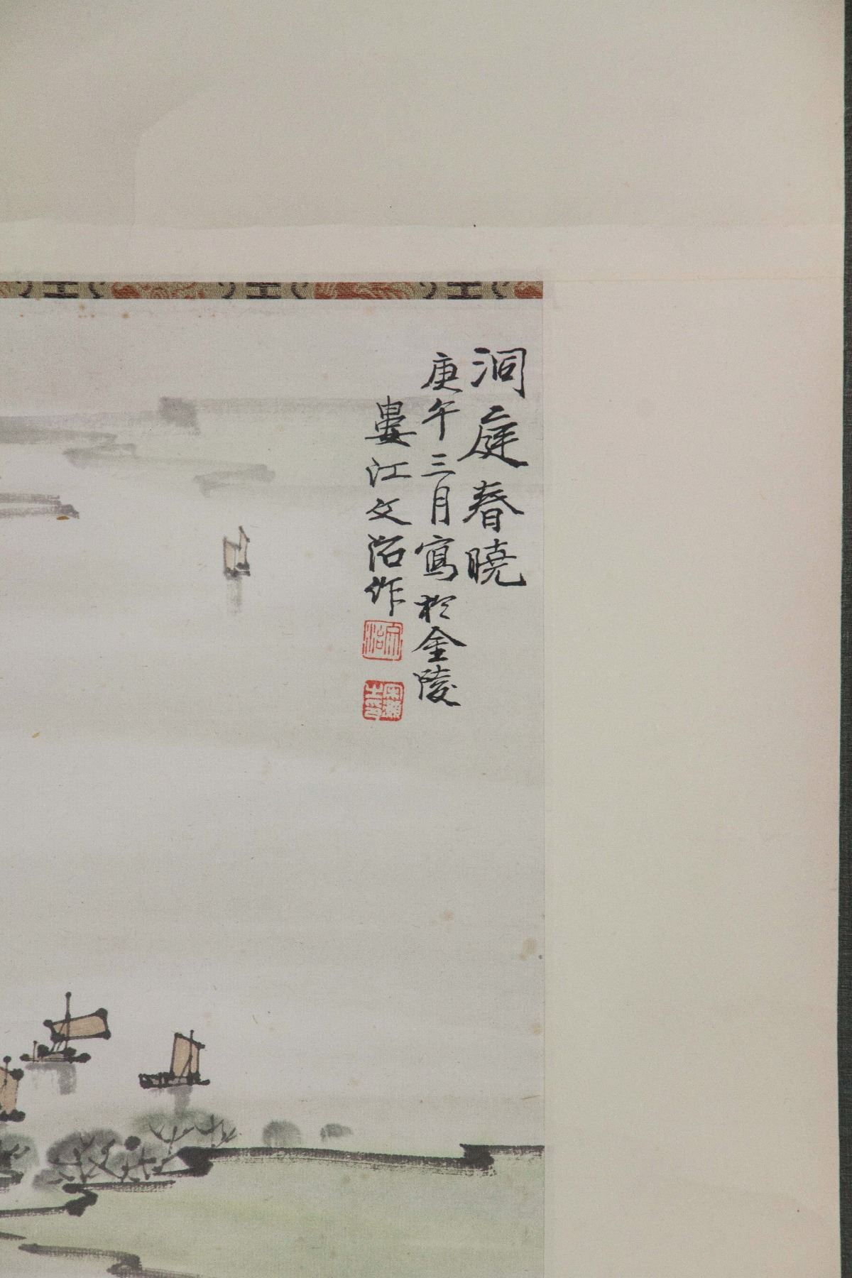Spring mountainous landscape of Dongting Lake; Chinese ink and watercolour on paper; hanging scroll; signed Song Wenzhi (1919-1999); inscribed with 2 artist seals; 67cm x 33cm
