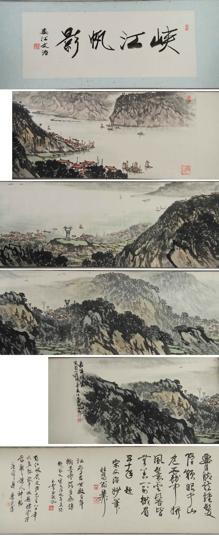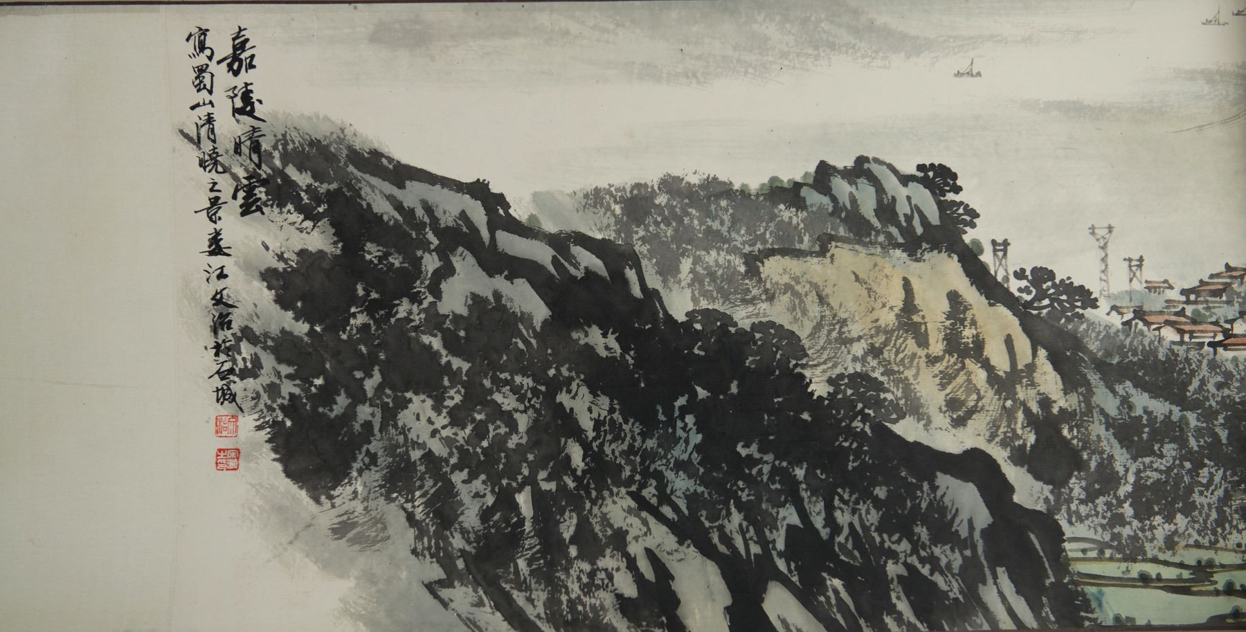 Chinese landscape, long horizontal hanging scroll, Chinese ink and watercolour on paper, signed Song Wen Zhi (1919-1999) with seals; 22 cm x 58 cm (first panel), 30 cm x 247 cm (second panel)