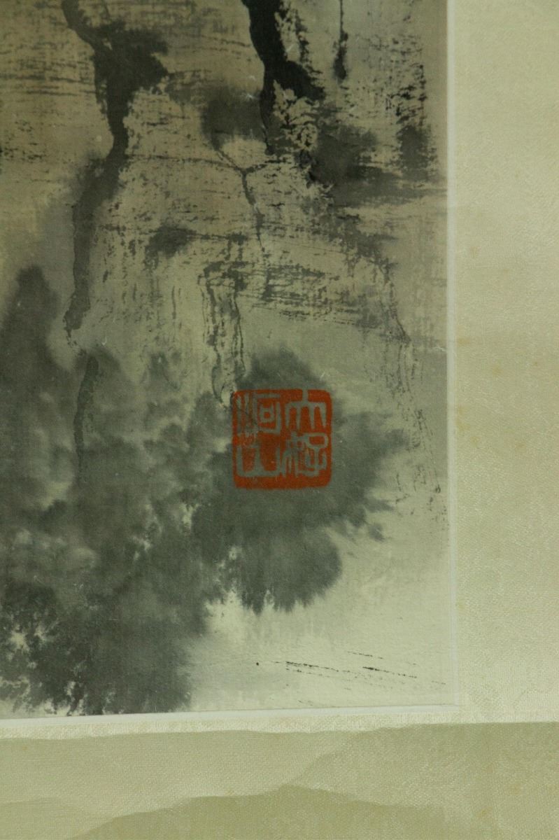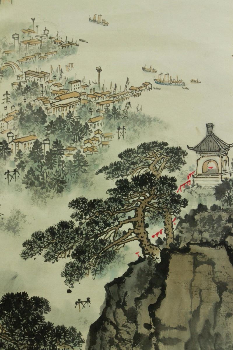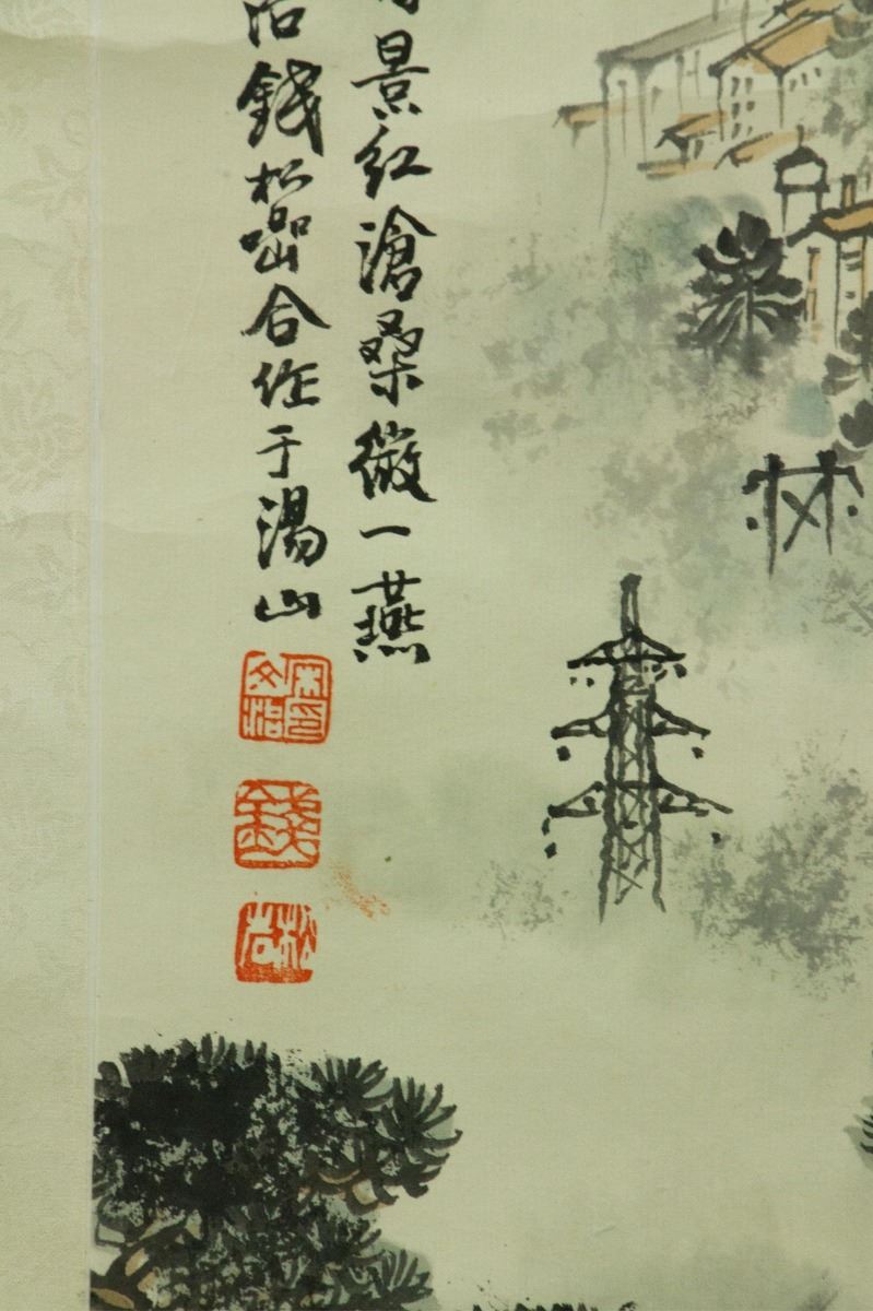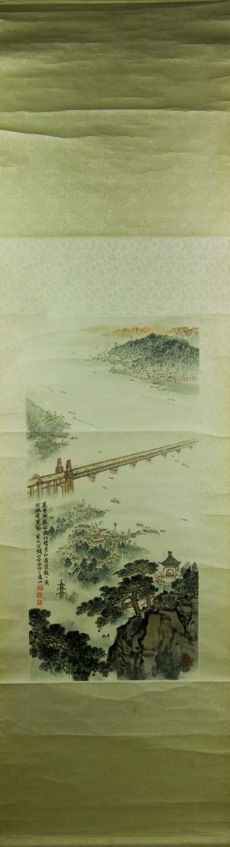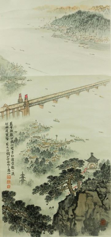Bridge on river; Chinese ink and watercolour on paper; hanging Scroll; signed Song Wenzhi and Qian Songyan and inscribed with four artist seals; 95 cm x 44.5 cm