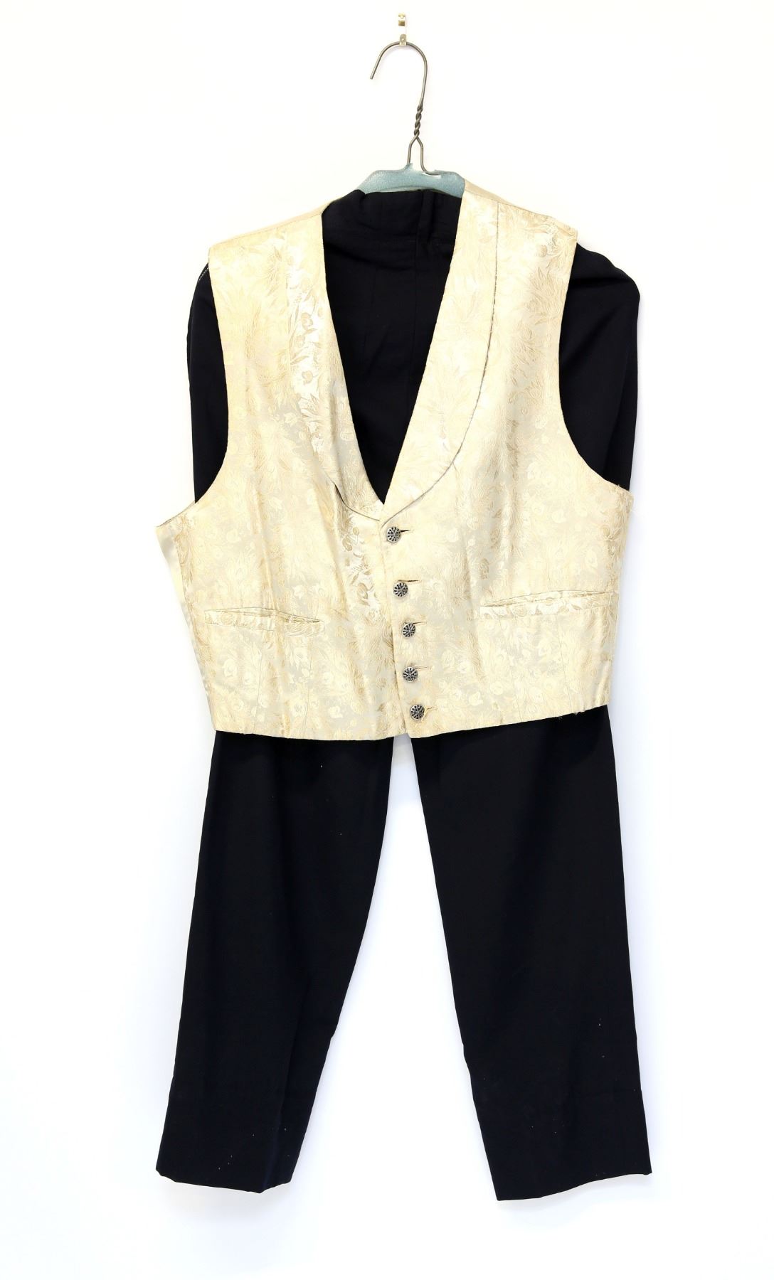 Song Without End (1960) - Dirk Bogarde as Franz Liszt, production made gold coloured waistcoat and black trousers. The waistcoat with Western Costume Co stamp and barcode (40980168) to inside. The trousers with inscribed Western Costumes Co label (No. 2409-5, Name: Dirk Bogarde, Sleeve 7, Waist, Inseam 32), barcode (40208168) and remanence of stamp within.