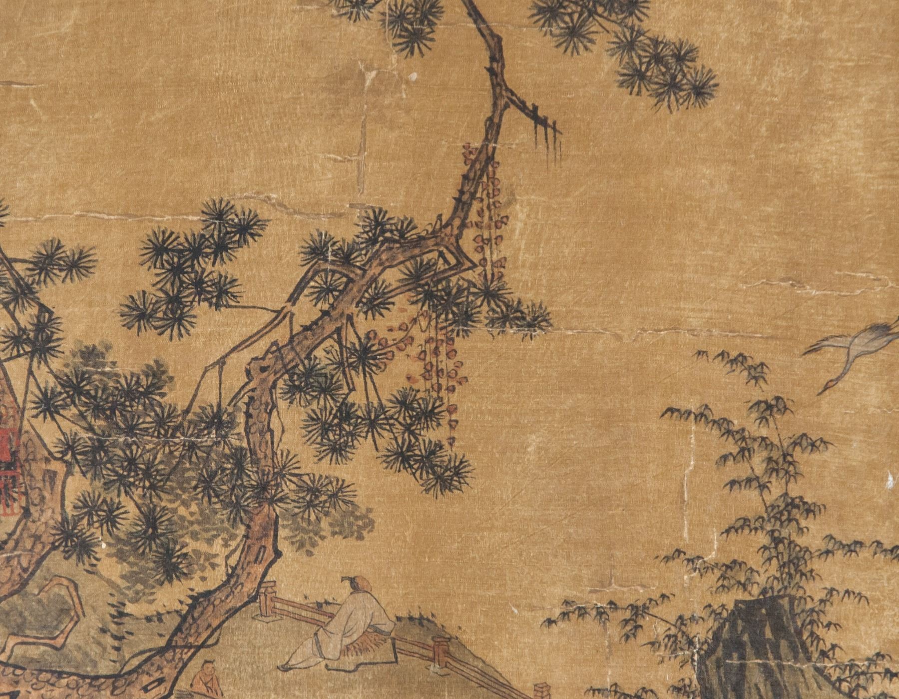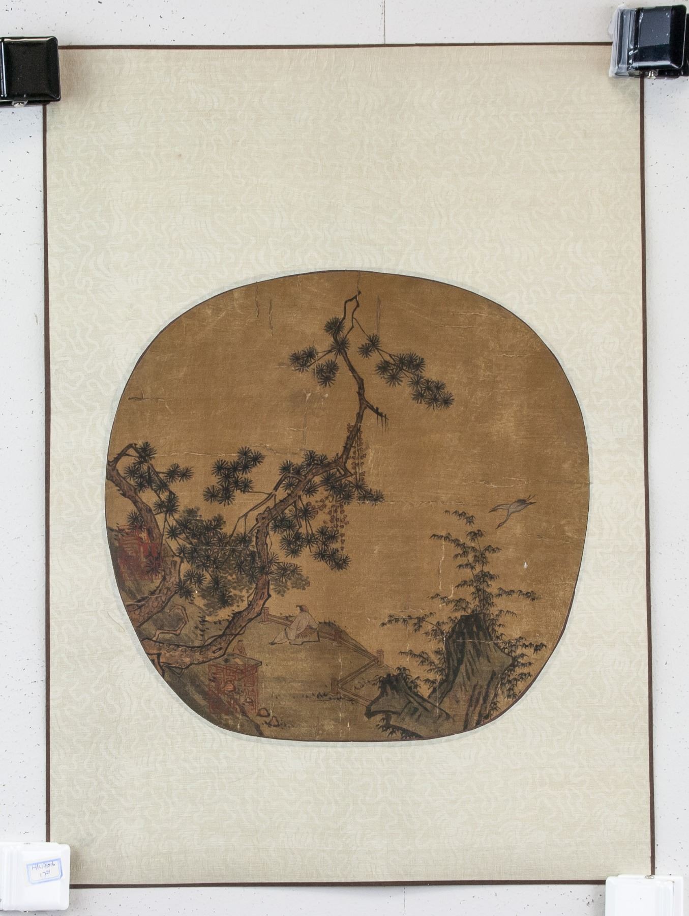 Pine tree and hermits; Chinese ink and watercolour on silk roll; inscribed with 2 seals; Song or Yuan dynasty style; 26 x 26cm. PROVENANCE: Private collection, China.