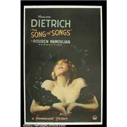 Song of Songs (Paramount 1933) One Sheet (27" X 41") Style A. Marlene Dietrich"s name above a film's title was enough to inspire mystery and intense interest on the part of the public. When she arrived from Germany in 1930, she was launched into a series of films that would make Marlene Dietrich one of the greatest stars of the 1930s. The "Song of Songs" one sheet offered here was based on a photo by Clarence Sinclair Bull, and remains the most beautiful and important of all of Dietrich's posters! This is the only known copy! Very Fine on Linen. Important notice: We expect to be auctioning lots at the rate of 200-250 per hour. Sometimes eBay Premier live bid software cannot keep up with that pace, so we strongly recommend that you place a realistic proxy bid now as insurance to avoid disappointment. Also please note that all Heritage/CAA lots purchased through eBay Premier carry a 20% Buyer's Premium.