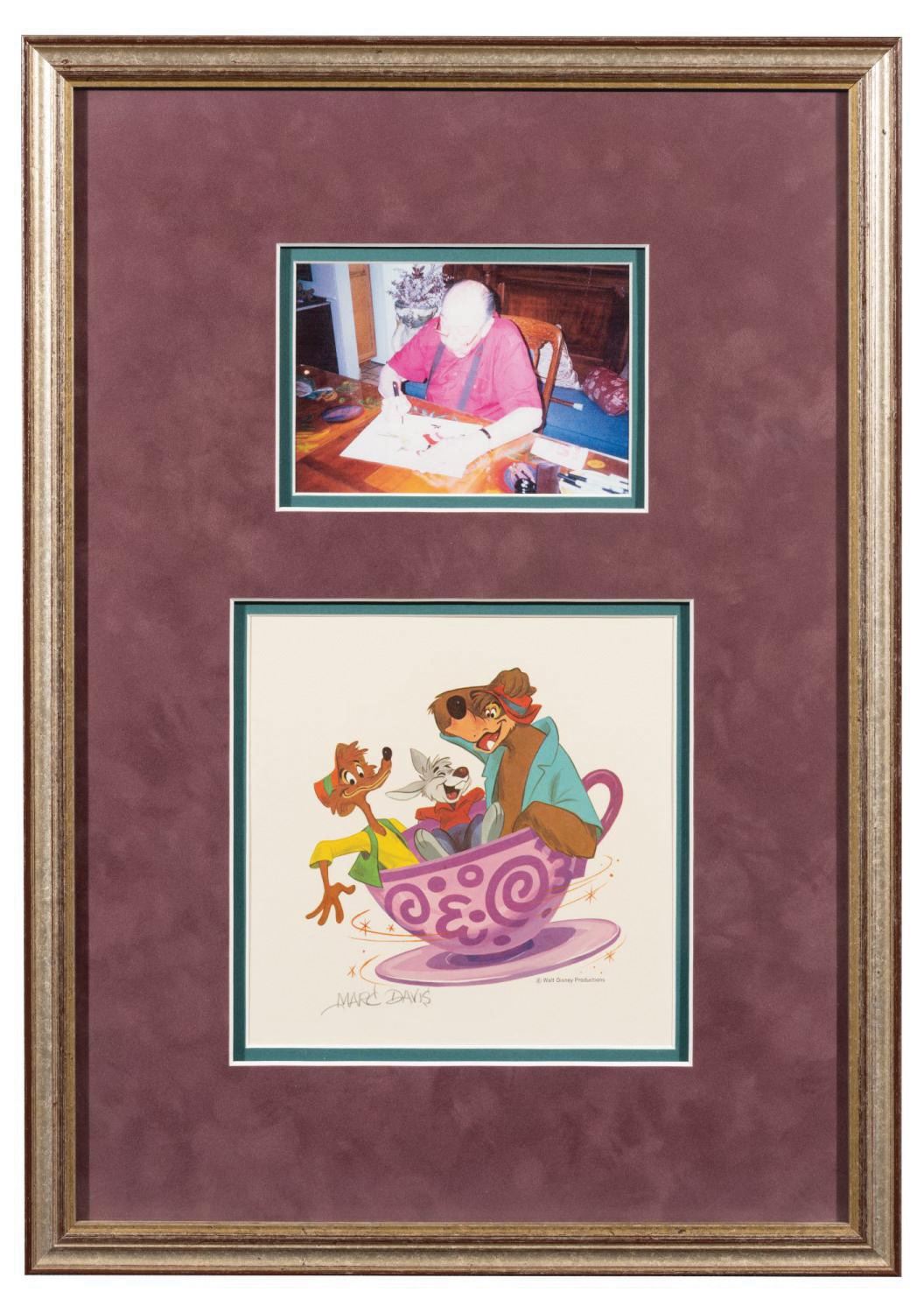 (Disney, 1995) A framed print by Imagineer Marc Davis depicting Song of the South characters enjoying the Mad Tea Cups attraction. The print is signed in pencil by Davis, and is framed along with a photo of Davis. The 14.5"x20.25" framed display is in very good condition, exhibiting the slightest wear to the frame. A "from the desk of Marc Davis" Letter of Authenticity is attached to the reverse.