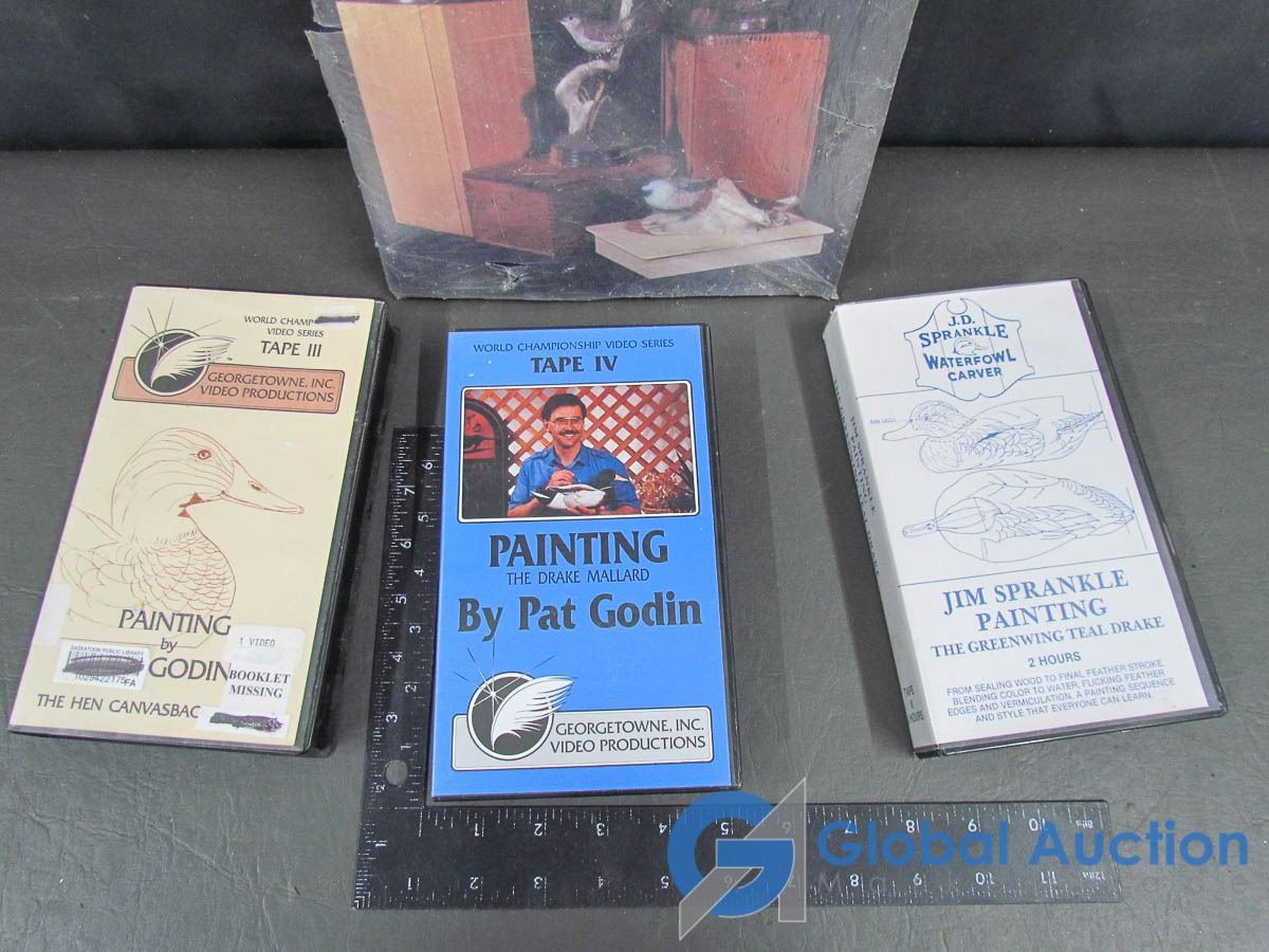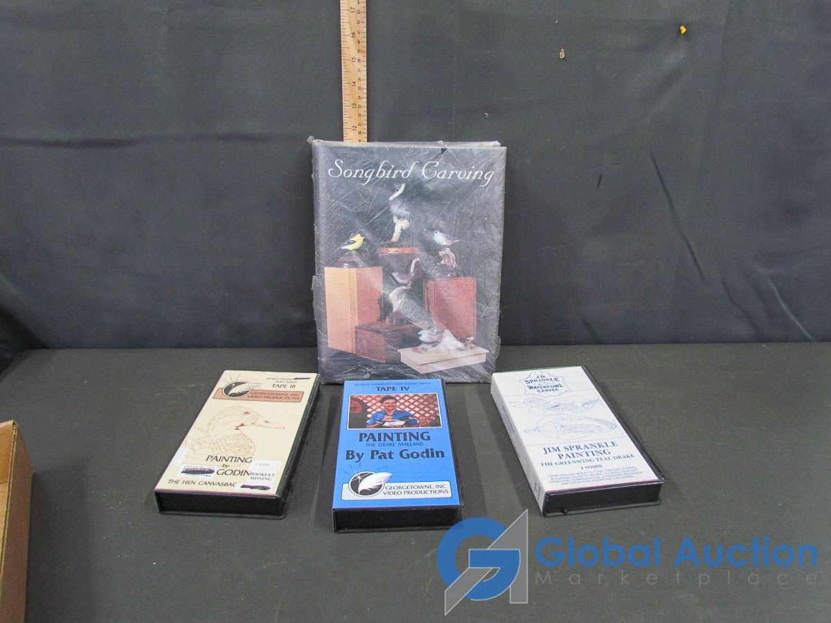 Songbird Carving Book,& (3)VHS Tape: Painting The Drake IV; Georgetowne Inc. Video Productions "Painting" Tape III; & J.D. Spankle WaterFowl Carver