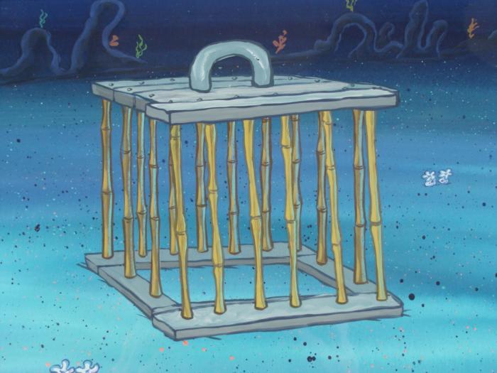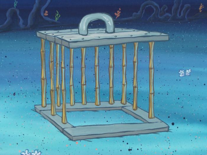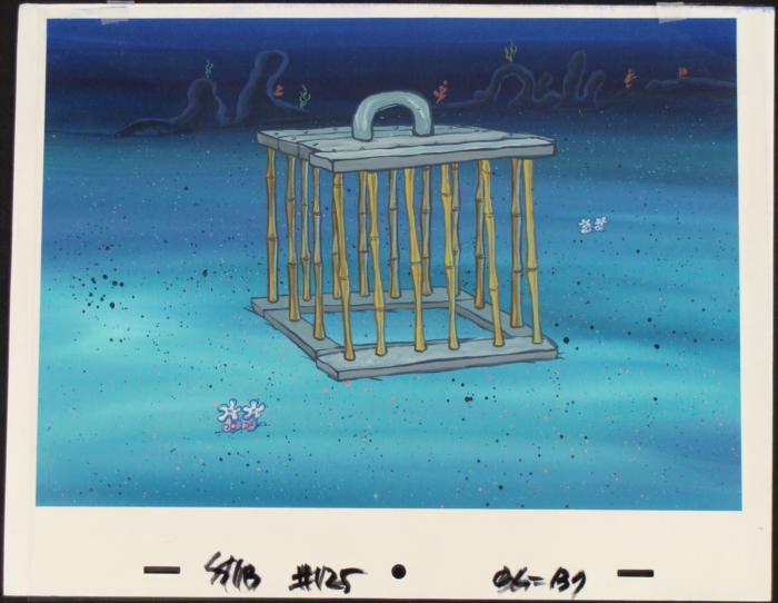 This is an original hand-painted background and cel from the Nickelodeon television show SpongeBob Squarepants. The story takes place under the deep blue sea in Bikini Bottom, where SpongeBob resides. SpongeBob, who is a yellow, porous sponge, is your typical happy-go-lucky character, as he is always cheerful and enjoys making people laugh. His best friend and neighbor is Patrick Star, a starfish who boasts knowing nothing and is often getting himself into ridiculous situations. Between the homes of these two lies the home of the miserable Squidward, a squid, who is known for being grouchy and playing tricks on SpongeBob and Patrick. Both SpongeBob and Squidward work at the Krusty Krab, a fast food business run by the greedy money-loving Mr. Krabs, a crab, the arch rival of the evil, possibly misunderstood, Plankton. Another neighbor, Sandy Cheeks, an athletic squirrel who normally wears an astronaut's space suit, was introduced in "Tea at the Treedome." She spends most of her time inventing and experimenting. This background shows a cage on the ocean floor. Original Production Background on paper, with peg holes; the front row of bars is painted on the cel overlay Size of sheet: 10 1/8 x 13 inchesVery good condition, with slight margin wear; has been stored rolledOriginal Production Backgrounds are used in the making of the final version of animated productions. The background establishes the location and the overall good mood of the scene. Typically, a background layout artist creates a drawing to establish the content of the scene, placement of characters, perspective and camera angle. Based on this drawing, the background artist creates a preliminary painting to confirm all of the scenes details, then the final production background which is used in the filming of the scene. When these backgrounds are individually photographed behind the progression of production cels, and projected at a rapid succession, the images in the foreground appear to move, creating an animated scene. The background is ready to be matted and framed. It includes animator's notations at the lower edge.