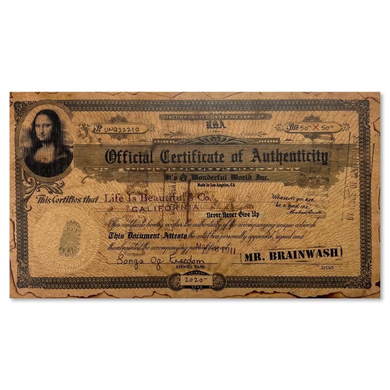 "Songs of Freedom" is a unique (UNIQ) mixed media on deckle edge paper by Mr. Brainwash, hand signed inverso and bearing the thumbprint of the artist. Includes Certificate of Authenticity. Measures approx. 50" x 50" (image).