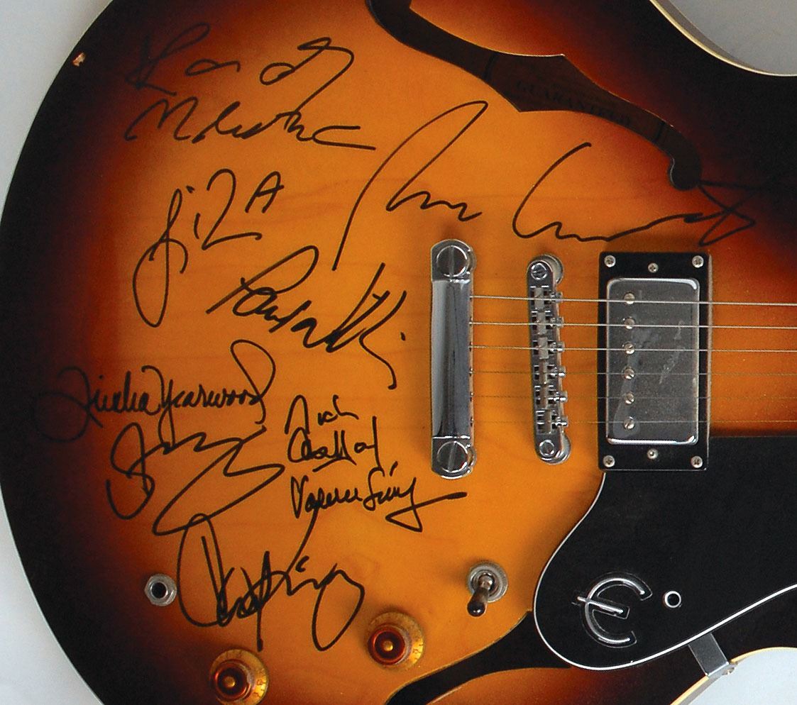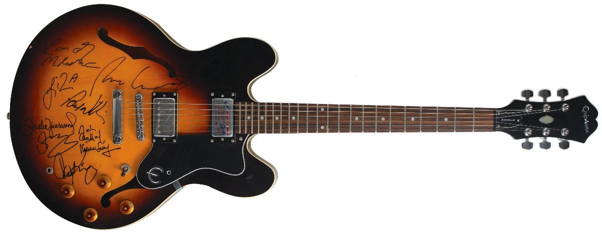 Sensational right-handed sunburst-finish semi-hollowbody Epiphone Dot electric guitar, serial No. I00051817, signed on the body in black felt tip by Liza Minnelli, Trisha Yearwood, Carole King, Randy Newman, Paul Williams, Sting, Nickolas Ashford and Valerie Simpson, and Rufus Wainwright. In fine condition, with trivial scuffing and a couple chips to the body. Oversized. A unique array of musical talent, featuring several artists who either attended or were inducted into the Songwriters Hall of Fame on June 13, 2002. Originally obtained by in-person specialist Mike Wehrmann.