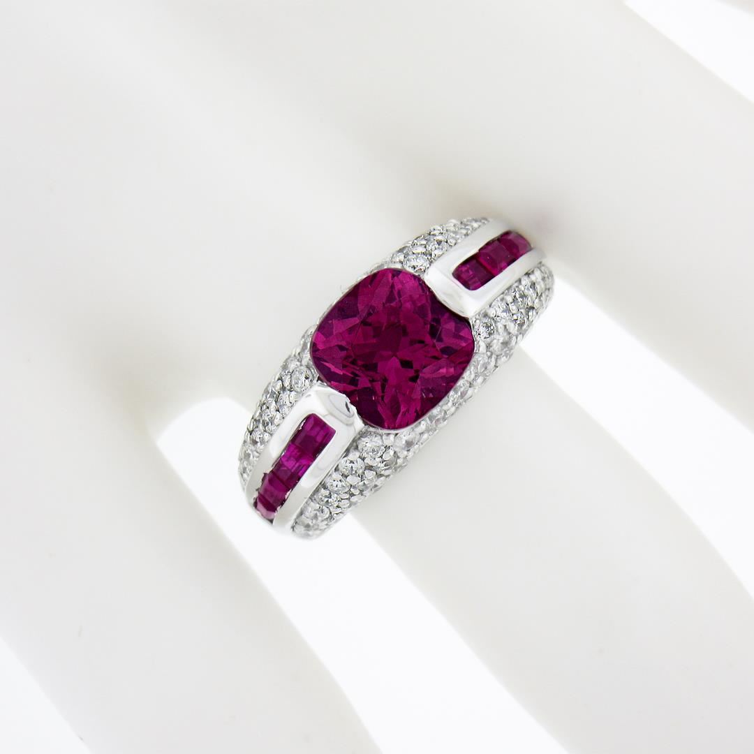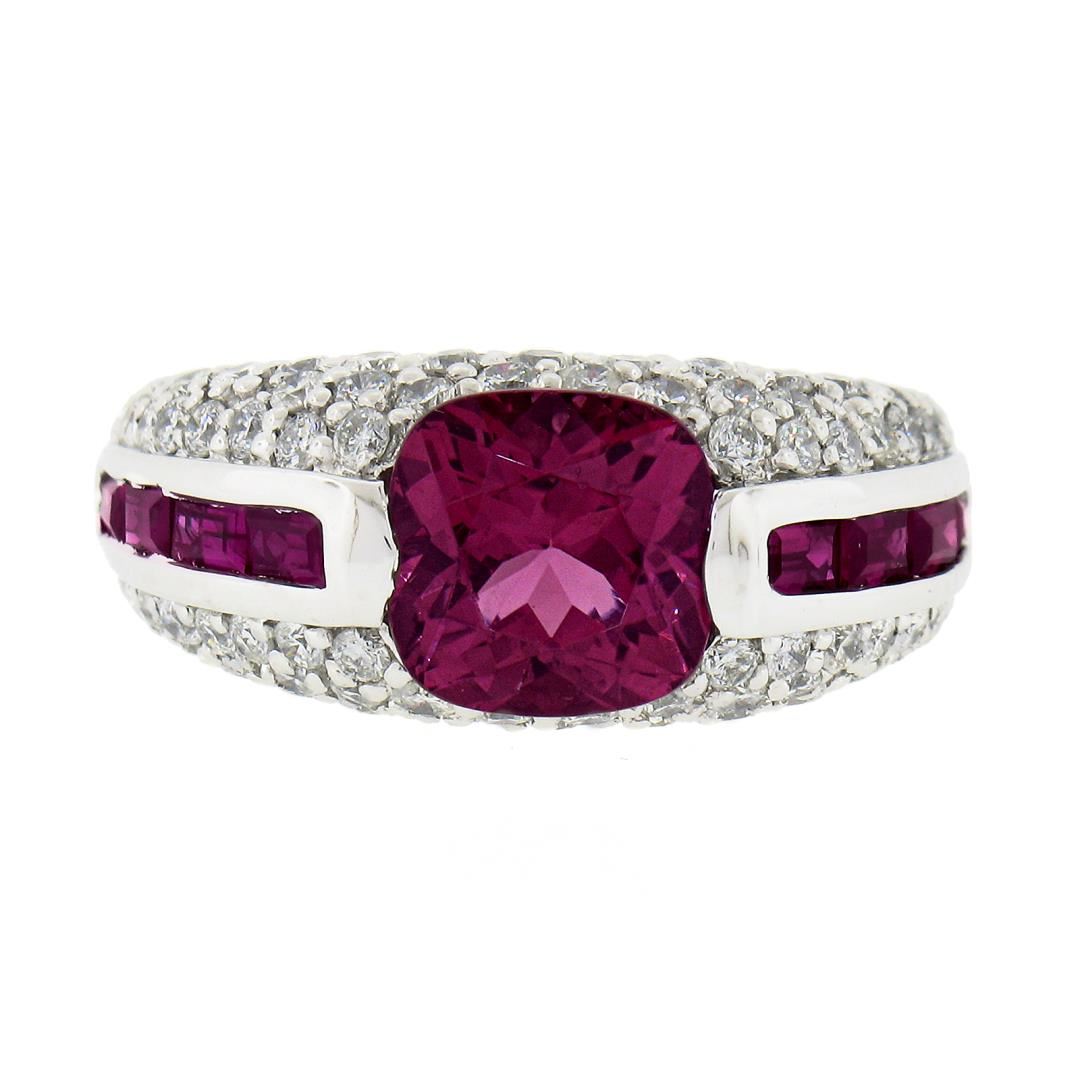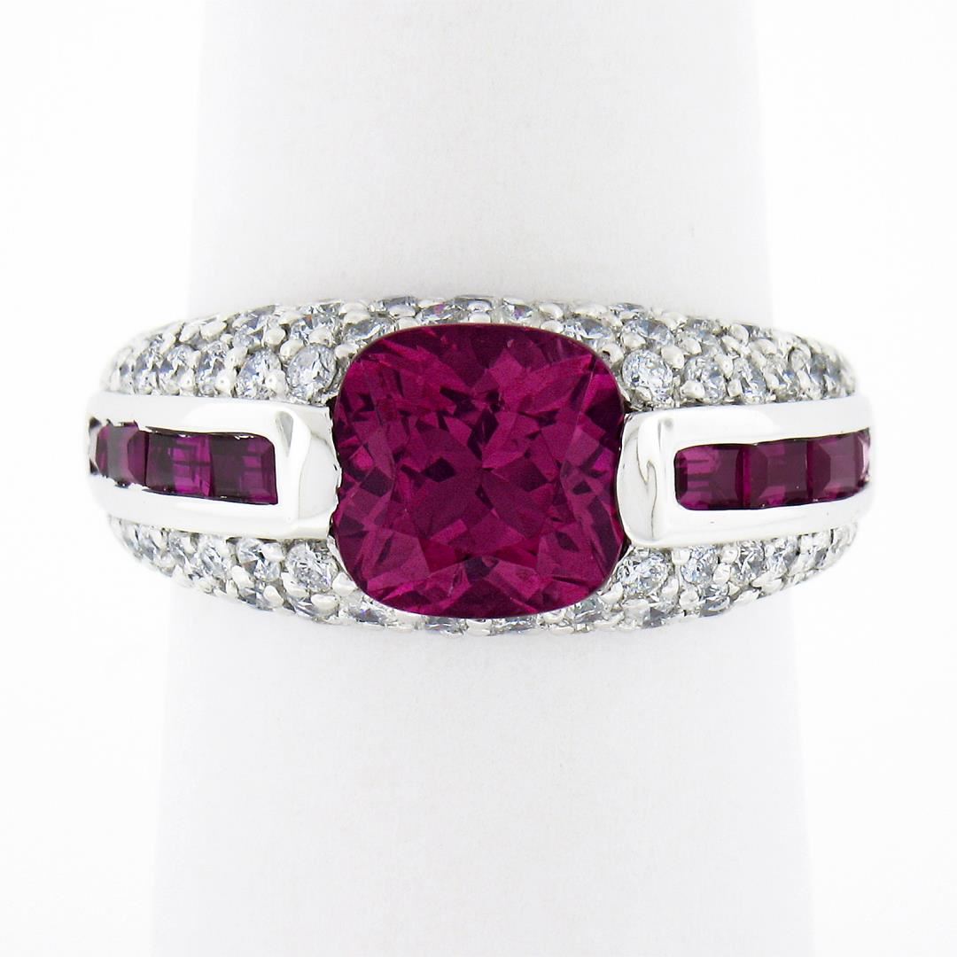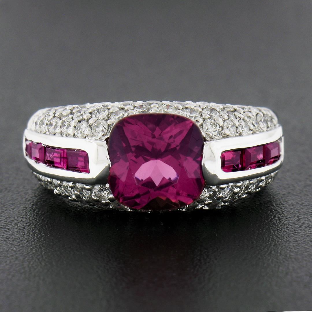 A solid 18k white gold ring by Sonia B., featuring 1 cushion cut natural pink tourmaline (8x8mm / 2.60ct), 8 baguette cut natural spinel (0.80ctw), and 66 round brilliant cut natural diamonds (G/H - SI1/I1 ; 1.05ctw). The ring is size 7.0, weighs a total of 10.11 grams, and measures 9.4mm wide.