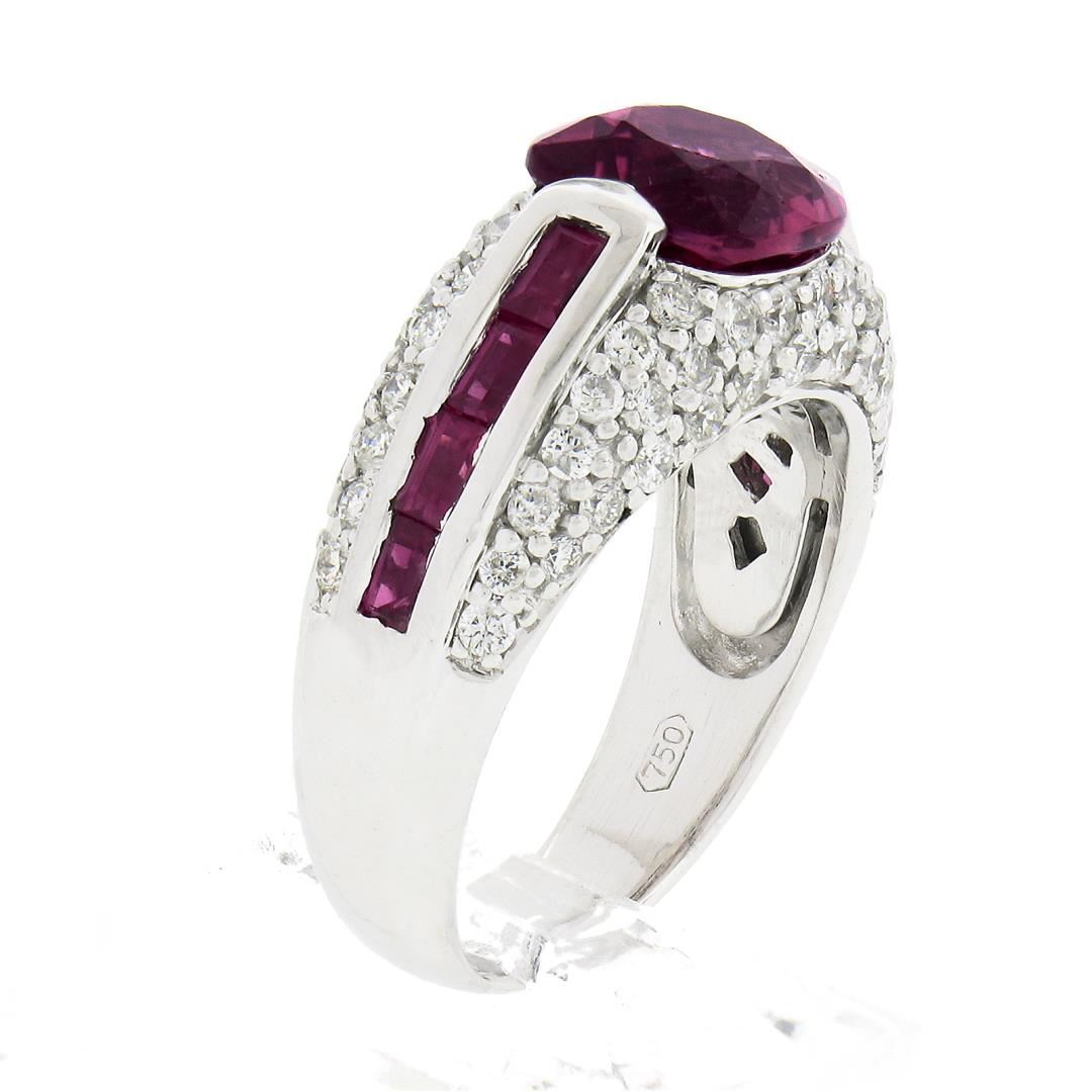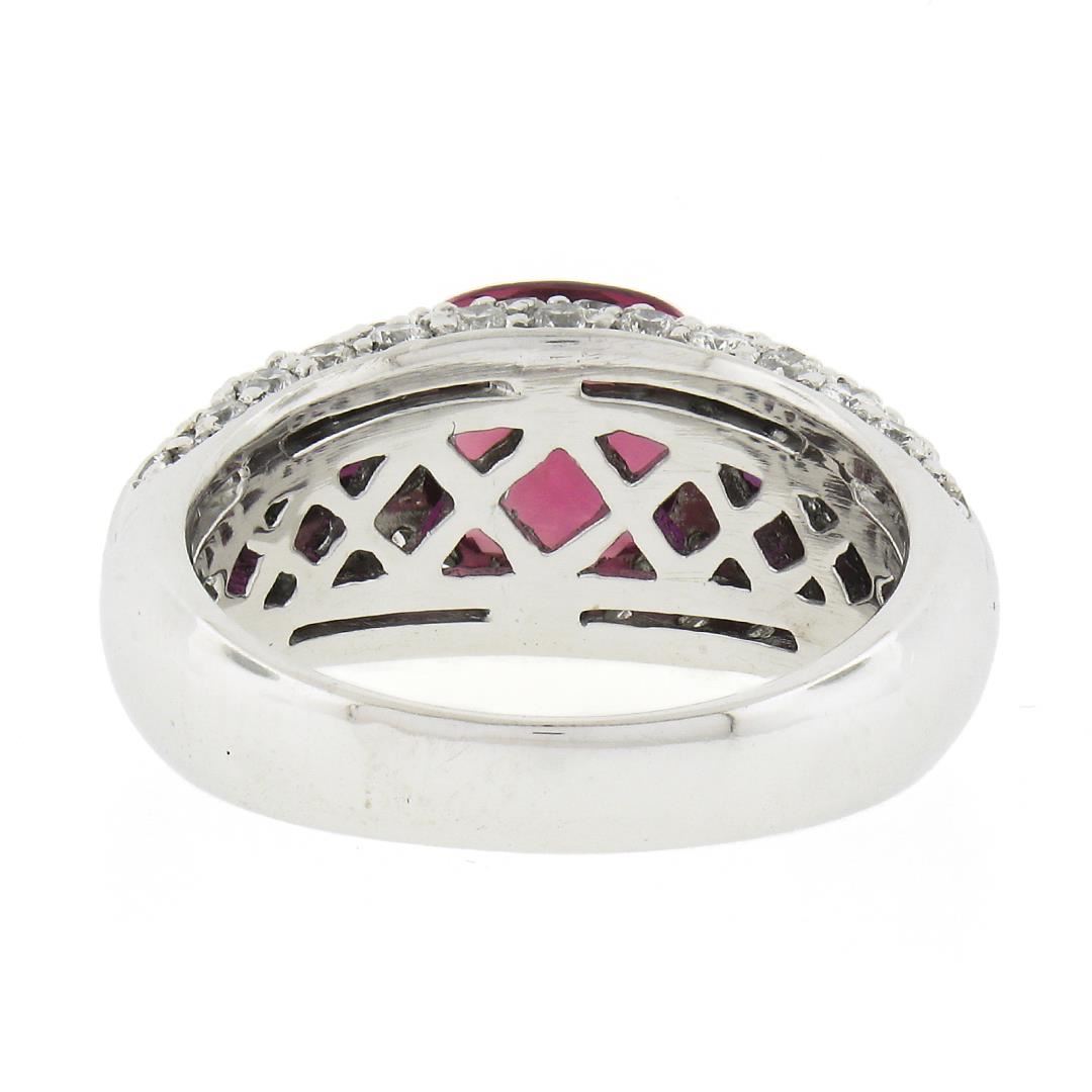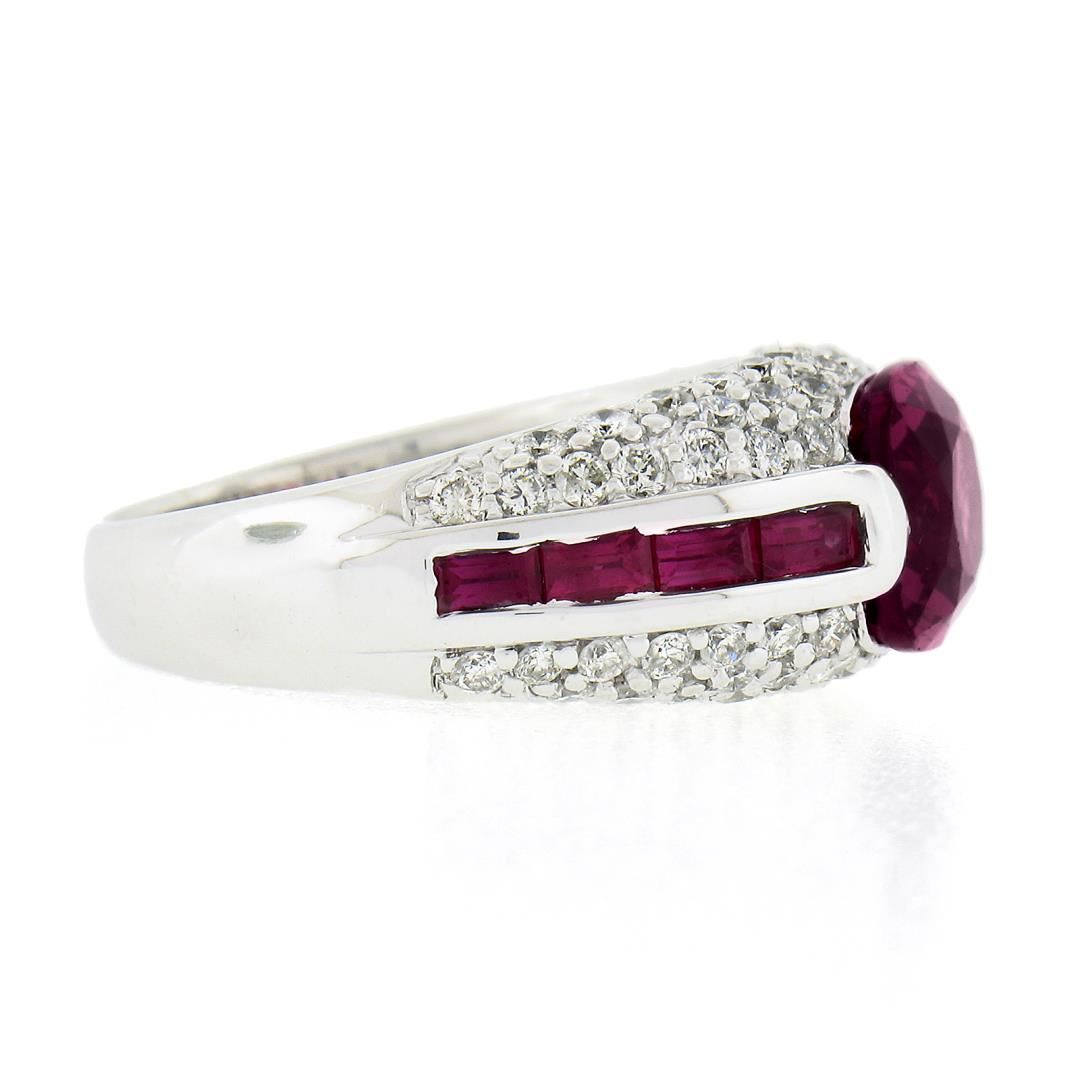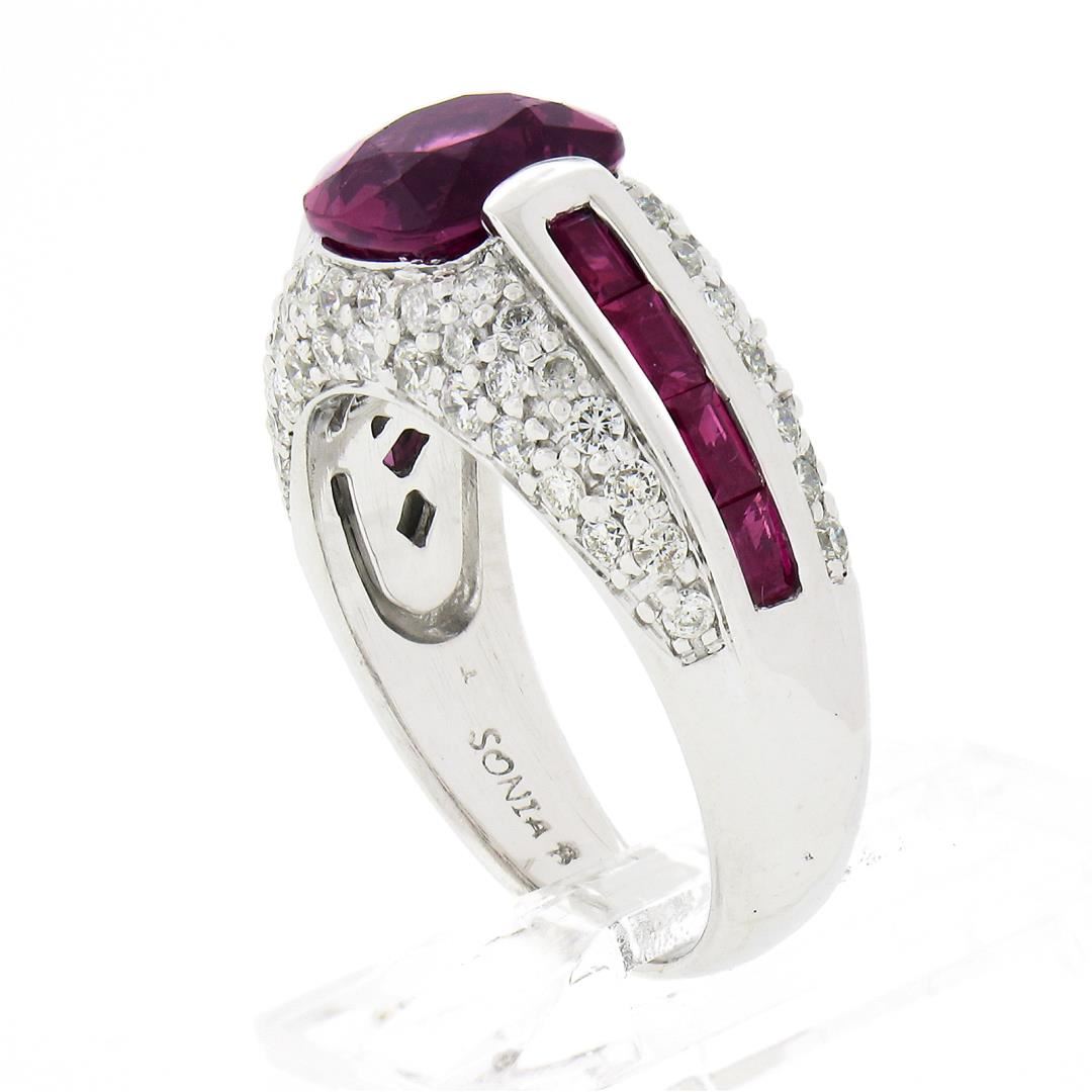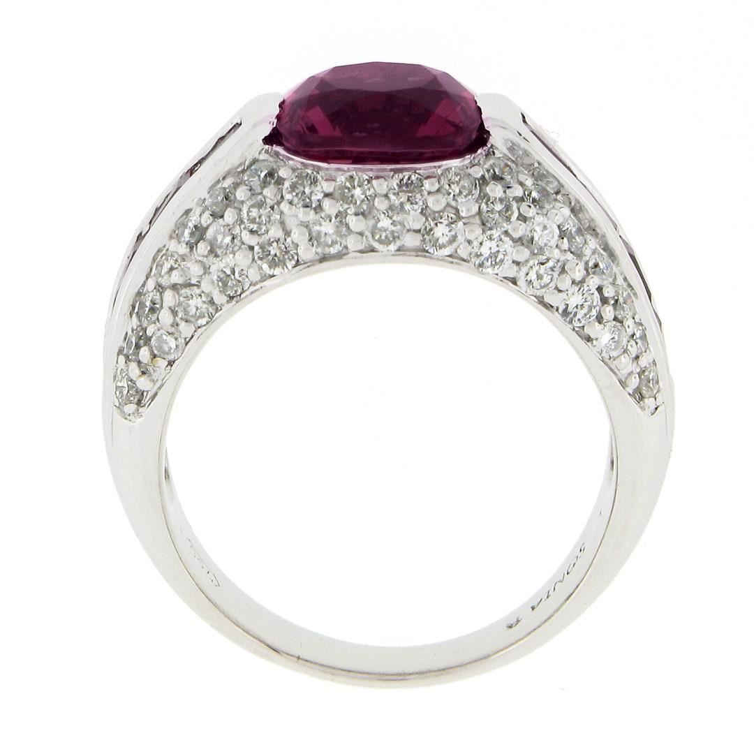 A solid 18k white gold ring by Sonia B., featuring 1 cushion cut natural pink tourmaline (8x8mm / 2.60ct), 8 baguette cut natural spinel (0.80ctw), and 66 round brilliant cut natural diamonds (G/H - SI1/I1 ; 1.05ctw). The ring is size 7.0, weighs a total of 10.11 grams, and measures 9.4mm wide.