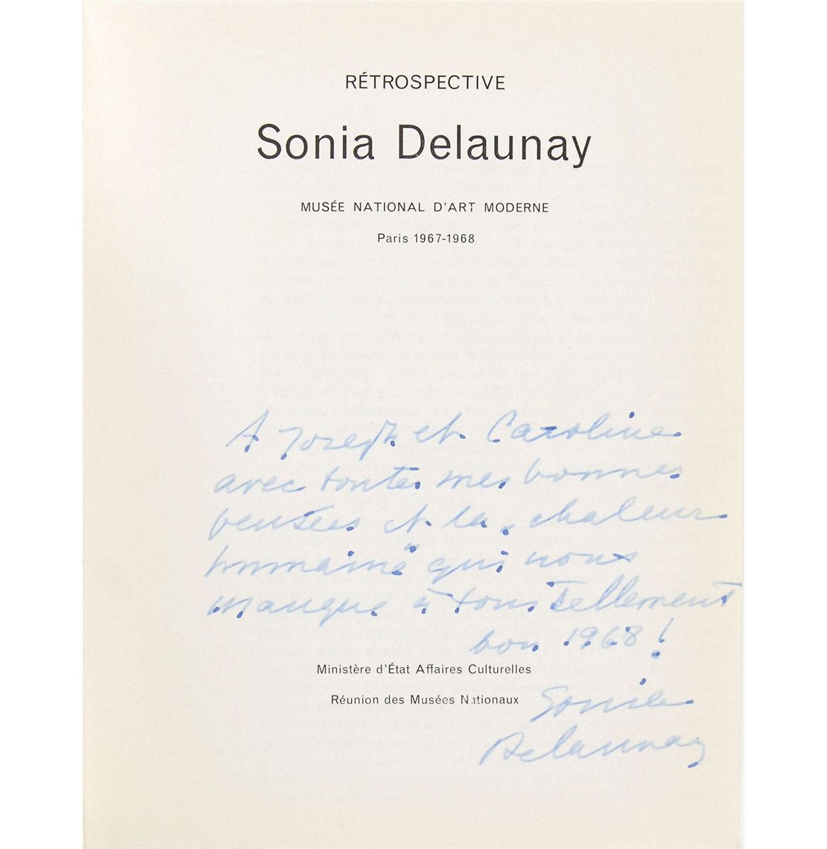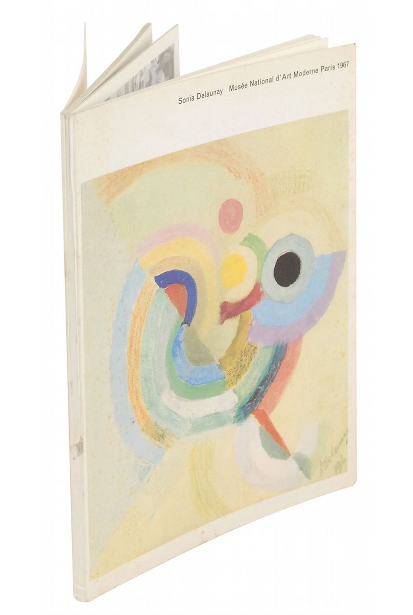 Jewish-French artist (1885–1979) who, along with her husband, co-founded the Orphism art movement. Exhibition catalog for a Delaunay retrospective at the Musee National D’Art Moderne, 6.5 x 8.25, signed and inscribed on the title page in French in blue ink. In fine condition, with notations and owner’s signature to first free end page and some light toning and foxing to covers.