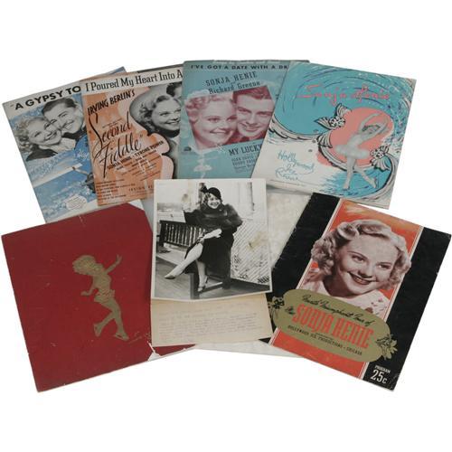 <B>Sonja Henie Programs and More.</B></I> Includes program books from Henie's 1940, '47, '49, and '51 tours, vintage sheet music for songs from her movies <I>Second Fiddle,</B></I> <I>My Lucky Star,</B></I> and <I>Happy Landing,</B></I> and a b&w 7" x 9" photo of Henie. In overall Fine to Very Fine condition with mild to moderate wear.<BR><BR><b>Shipping:</b> Books & Catalogs (<a target="_blank" href="http://www.heritageauctions.com/common/shipping.php">view shipping information</a>)