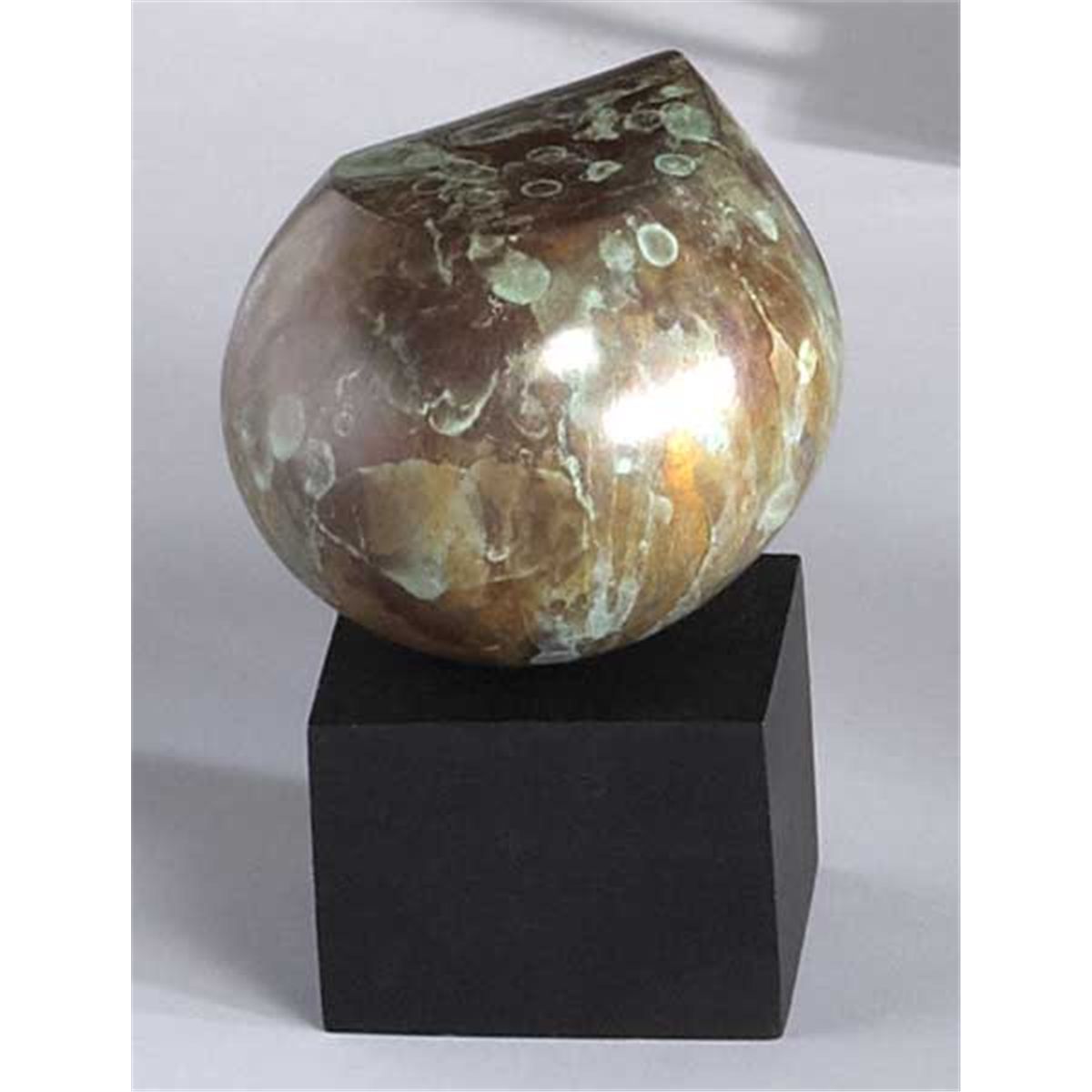 bronze with green patina on black wooden base
