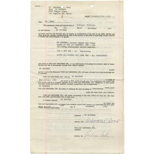 <B>Sonny Bono Signed Contract.</B></I> Three-page leasing agreement between Go Records and Vee Jay Records, dated December 5, 1961, signed "Salvador P. Bono" in blue ink on the front page. In Excellent condition with very light wear, fold creases, and binder holes to the top edge. <I>Accompanied by LOA from PSA/DNA.</B></I> <BR><BR><B>Important notic