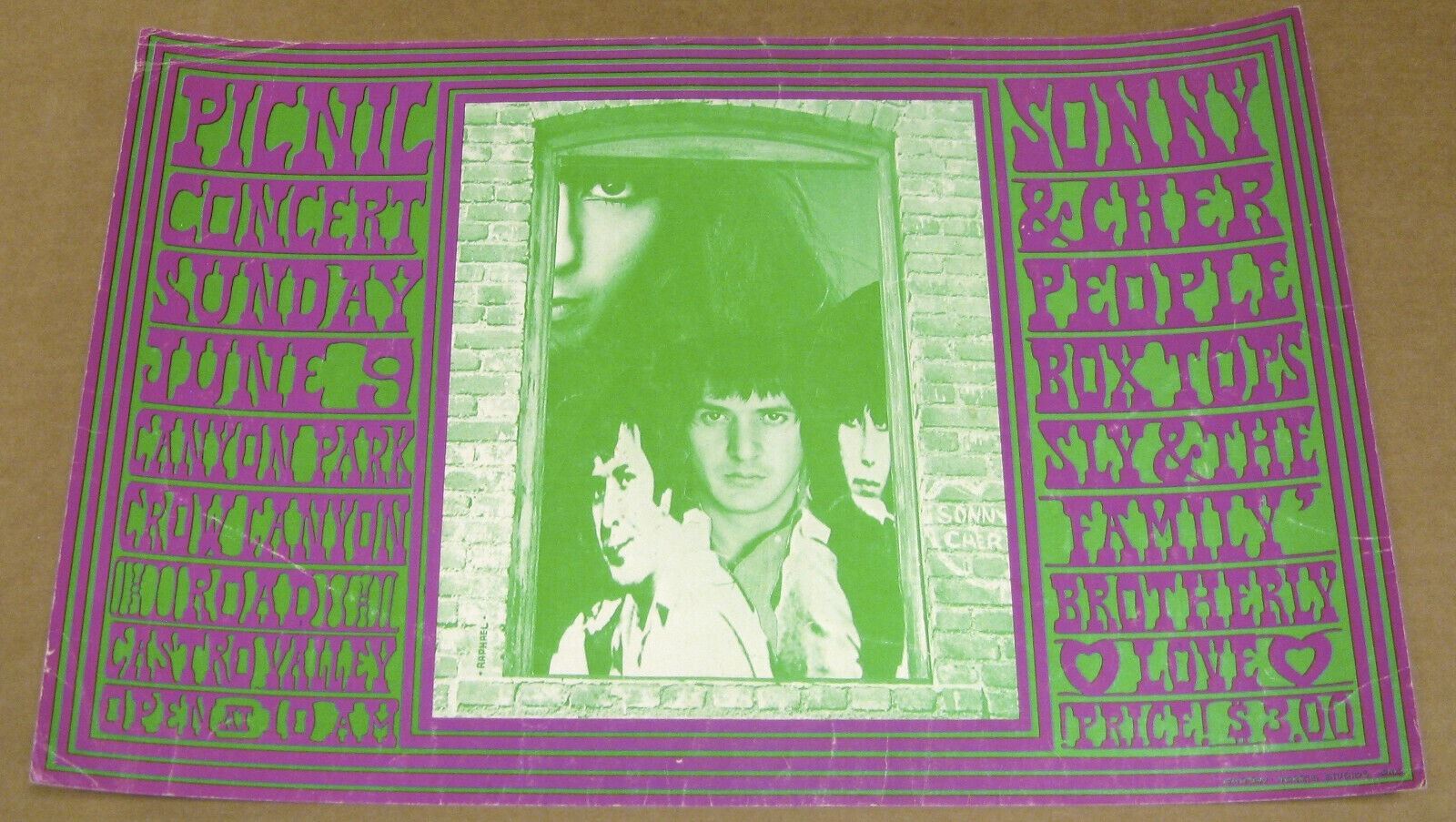 Original concert poster advertising a PICNIC CONCERT / Festival in 1968 featuring: SONNY & CHER, People, The Box Tops, Sly & The Family Stone, Brotherly Love and others on June 16, 1968 at Crow Canyon, Bjornson Park, Castro Valley, California.