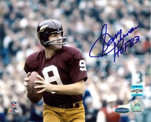 Sonny Jurgensen took over play-calling for the Redskins during the 1964 season. He was then selected to play in the Pro Bowl following the season and was also named second Team All-Pro. In 1967, Jurgensen broke his own record by passing for 3,747 yards and also set NFL single-season records for attempts (508) and completions (288). In many circles, Jurgensen is recognized as the finest pure passer of his time. A five-time Pro Bowl selection, he earned three NFL individual passing titles. Sonny Jurgensen has hand autographed this Washington Redskins Color 16X20 Photo with HOF 83 inscription. Jurgensen/Ironclad Hologram and Certificate of Authenticity.