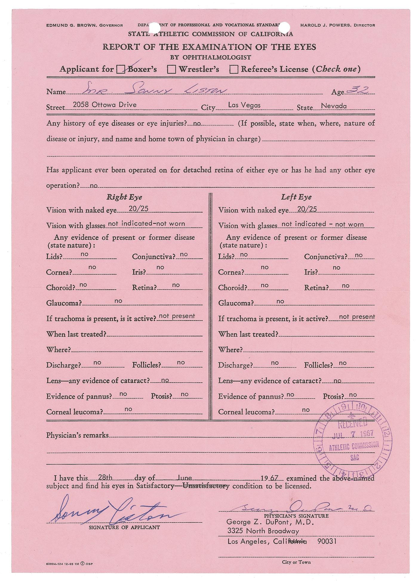 DS, one page, 8.5 x 12, June 28, 1967. California State Athletic Commission eye examination report for the then-32 year old Liston, showing he has 20/25 vision in both eyes and no sign of any eye diseases. Signed at the bottom in blue ballpoint by both Liston and the examining physician. In fine condition, with intersecting folds, scattered creasing, and two punch holes to top edge.
