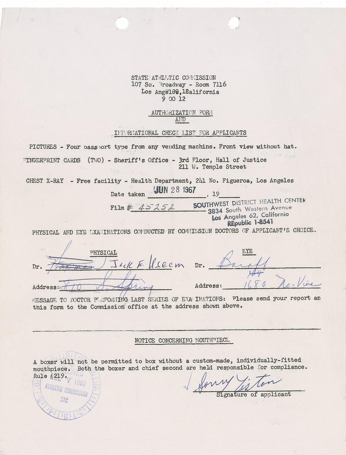 DS, one page, 8.5 x 11, July 7, 1967. California State Athletic Commission informational check list for license applicants, concerning photos, fingerprints, a chest x-ray, and physical and eye examinations. Bottom portion has a statement regarding mouthpieces stating “A boxer will not be permitted to box without a custom-made, individually-fitted mouthpiece.” Signed at the conclusion of the statement by Liston. Document is also signed by the two doctors. Central vertical fold, punch holes to top edge, and some light wrinkles and creases, otherwise fine condition. Liston would take a year off after his second loss to Muhammad Ali, fighting four times in Sweden in 1966–67, fighting again in California on May 23, 1968, beating Billy Joiner at the Olympic Auditorium.