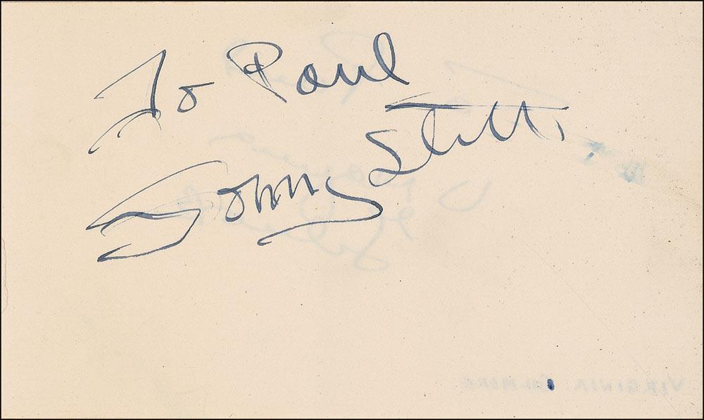 Prolific American saxophonist (1924–1982) best known for his work in the bebop and hard bop styles. Vintage ink signature, “To Paul, Sonny Stitt,” on a cream 5.5 x 3.25 album page. A few faint ink smudges, otherwise fine condition RRAuction COA.