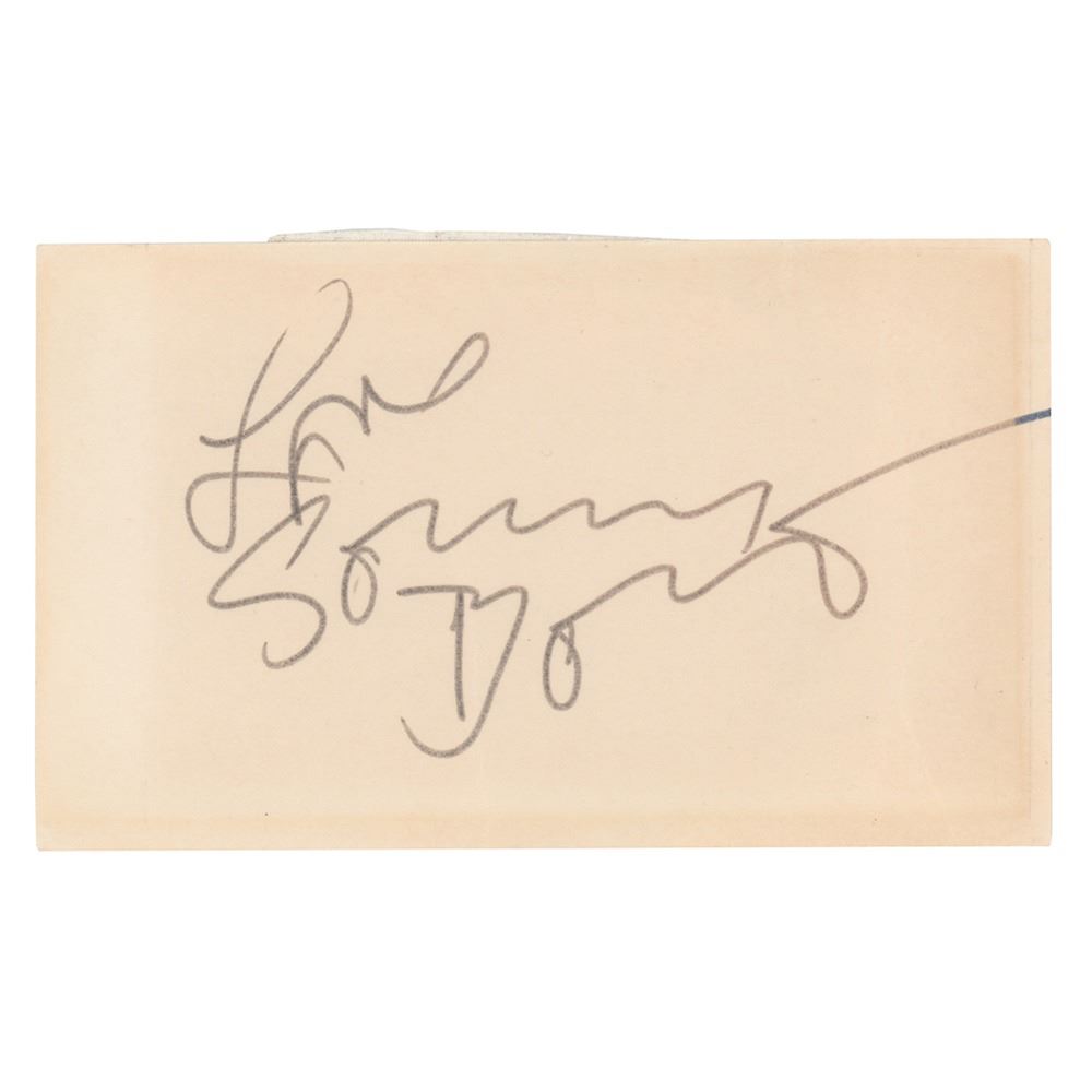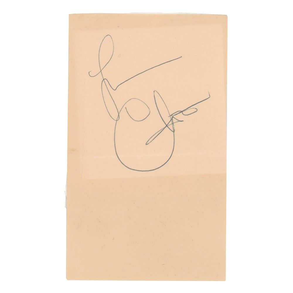 Two items: a ballpoint signature, "Love Cher," on an off-white 3 x 5 sheet; and an ink signature, "Love, Sonny Bono," on an off-white 5 x 3 sheet. Collector's notation to the reverse of the Cher sheet dates the to signature July 24, 1986, in Milton, Massachusetts, where she was filming The Witches of Eastwick. In overall fine condition, with mounting remnants to reverse of each. Accompanied by an unsigned glossy photo and an ATCO Records 7˝ single for 'I Got You Babe.'