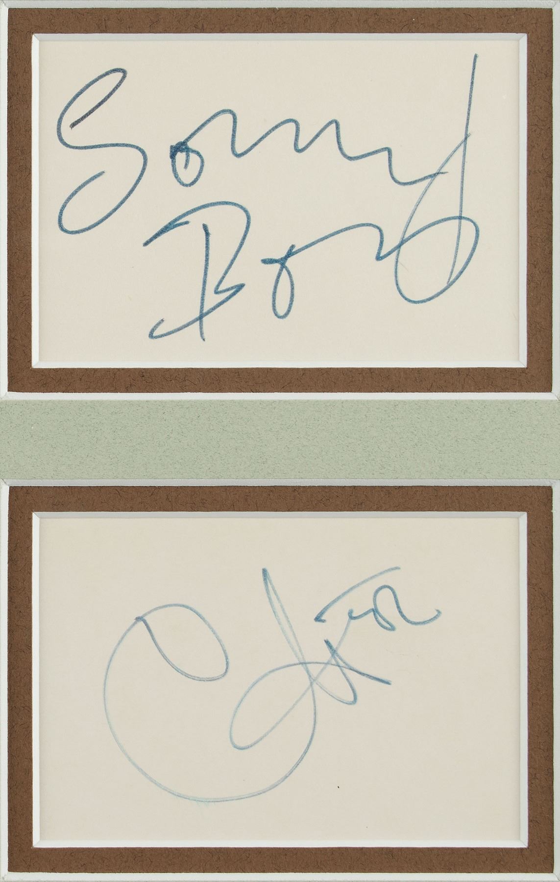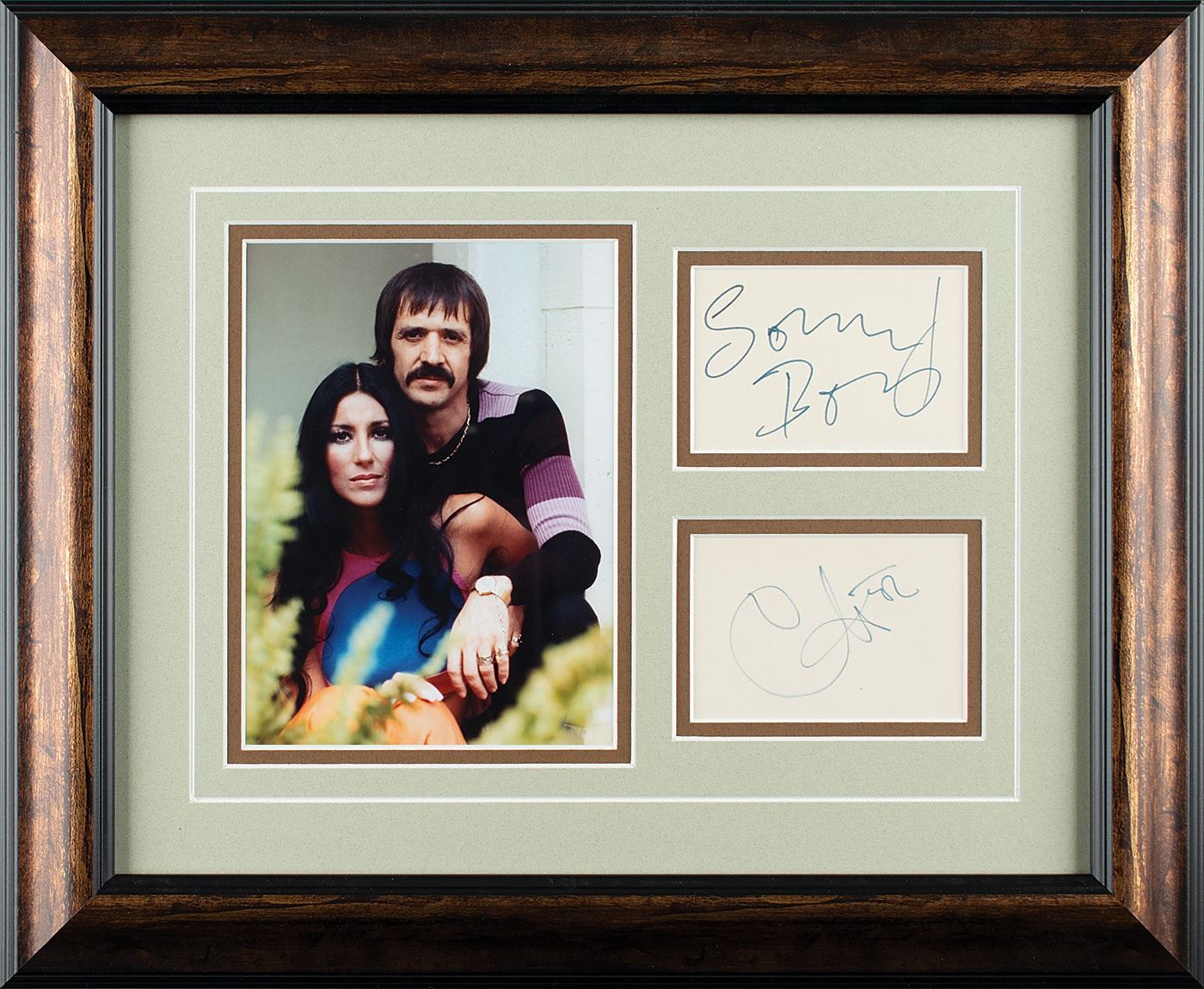 Felt tip signatures, "Sonny Bono" and "Cher," on individual off-white 3.75 x 2.5 cards. Double-matted and framed together with a color photo of the couple to an overall size of 16.75 x 13.75. In overall fine condition.