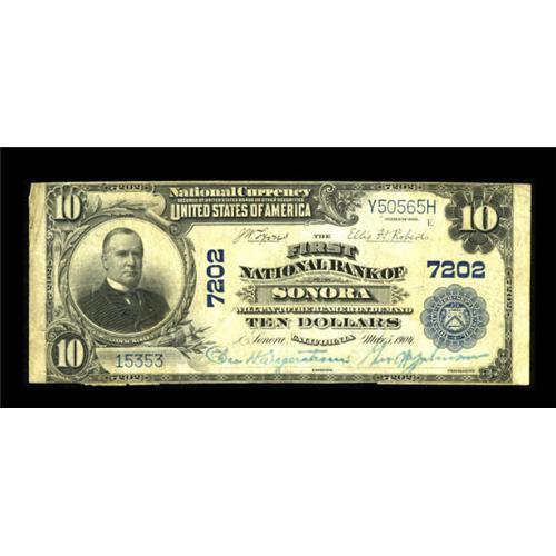 <B>Sonora, CA</B></I> - $10 1902 Plain Back Fr. 624 <B>The First NB</B></I> Ch. # 7202<BR> An evenly circulated large example from this small Gold Rush Tuolumne County community. <B>Very Good-Fine</B></I> with visible signatures and a little edge roughness at lower left.<BR><I>From The Kansas City Collection.</B></I><BR><BR><b>Shipping:</b> Coins & Currency (<a target="_blank" href="http://www.heritageauctions.com/common/shipping.php">view shipping information</a>)
