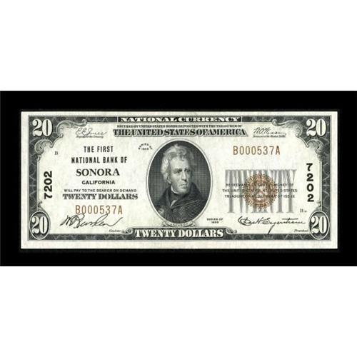 <B>Sonora, CA</B></I> - $20 1929 Ty. 1 <B>The First NB</B></I> Ch. # 7202<BR> This is a well embossed and fully original $20 from the only readily collectible bank in this Tuolumne County town. <B>Choice Crisp Uncirculated.</B></I><BR><BR><b>Shipping:</b> Coins & Currency (<a target="_blank" href="http://www.heritageauctions.com/common/shipping.php">view shipping information</a>)
