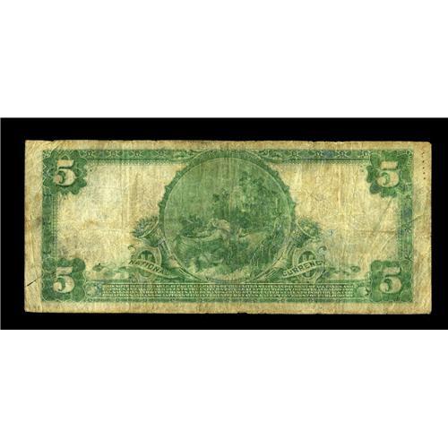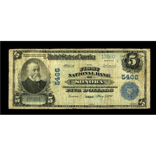 <B>Sonora, TX</B></I> - $5 1902 Plain Back Fr. 607 <B>The First NB</B></I> Ch. # 5466<BR>The census includes just ten large notes from here, including only two $5 Plain Backs. This appears to be a third of that type and denomination. It is a nicely margined <B>Fine,</B></I> more appealing visually on the face than the back. It should sell for roughly...<BR><BR><b>Shipping:</b> Coin/Currency (<a target="_blank" href="http://www.heritageauctions.com/common/shipping.php">view shipping information</a>)