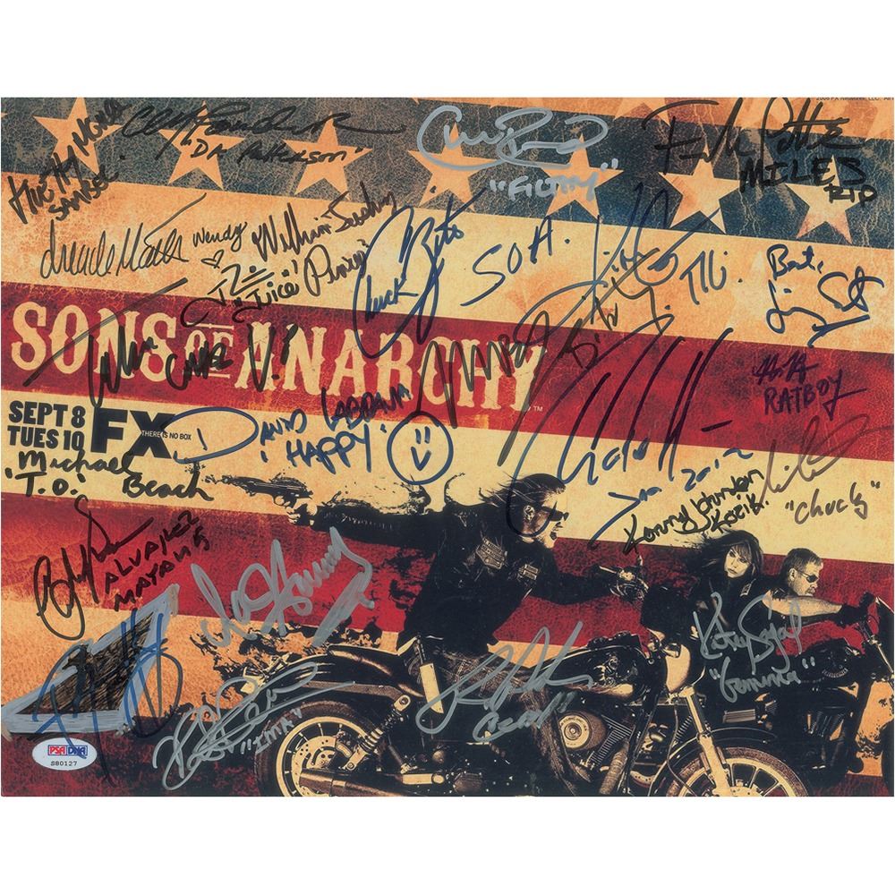 Color satin-finish 14 x 11 photo of an advertisement for the action-crime drama television series Sons of Anarchy, signed in silver ink and black felt tip by 22 members of the cast, with several adding their character names, including: Charlie Hunnam, Ron Perlman, Katey Sagal, CCH Pounder, Jimmy Smits, Chuck Zito, David Hasselhoff, Tommy Flanagan, Emilio Rivera, Mark Boone Junior, Kim Coates, Ryan Hurst, William Lucking, Michael Beach, Niko Nicotera, Kenny Johnson, Drea de Matteo, Kristen Renton, David Labrava, Theo Rossi, Christopher Douglas Reed, and Frank Potter. In fine condition, with a wrinkly crease touching one signature and a PSA/DNA label affixed to lower left corner.