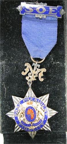 Sons of England Past President Suspended Badge with Ribbon and case, Sterling Silver, presented to JJ McAllister December 1937