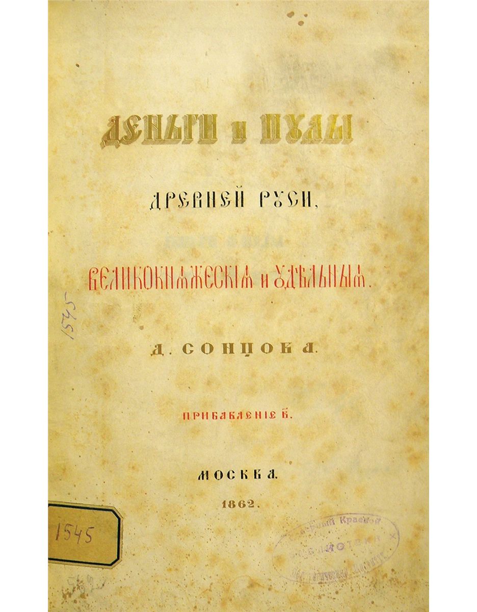 Sontsov, D. ДЕНЬГИ И ПУЛЫ ДРЕВНЕЙ РУСИ, ВЕЛИКОКНЯЖЕСКIЯ И УДѢЛЬНЫЯ. ПРИБАВЛЕНIЕ ВТОРОЕ. Moscow, 1862. 8vo, modern green cloth lettered in white; original decoratively printed front white and rear green wrap bound in. (4), 82, (4) pages; 2 tinted lithographic plates (Nos. 13-14); additional leaf of handwritten notes bound in. Inventory stickers to wraps; near fine. A scarce and important work by Dmitrii Petrovich Sontsov, being a supplemental volume to his 1860 publication devoted to the dengas and pulos of the Grand Princes and Feudal Period. Sontsov's principal 1860 work incorporates the first supplement, so the 1862 volume constitutes the second supplement. Gromachevskii 326б.